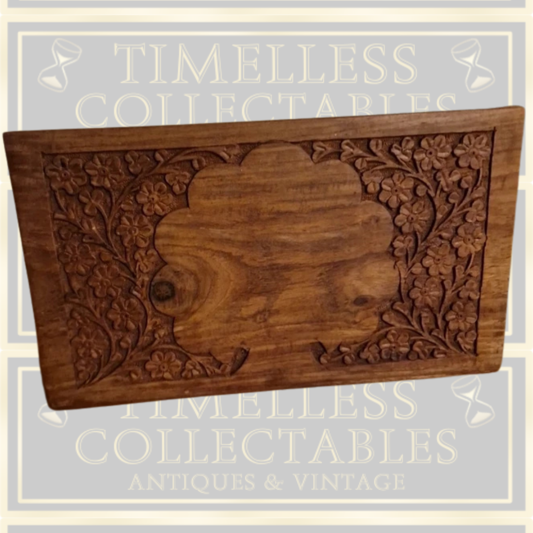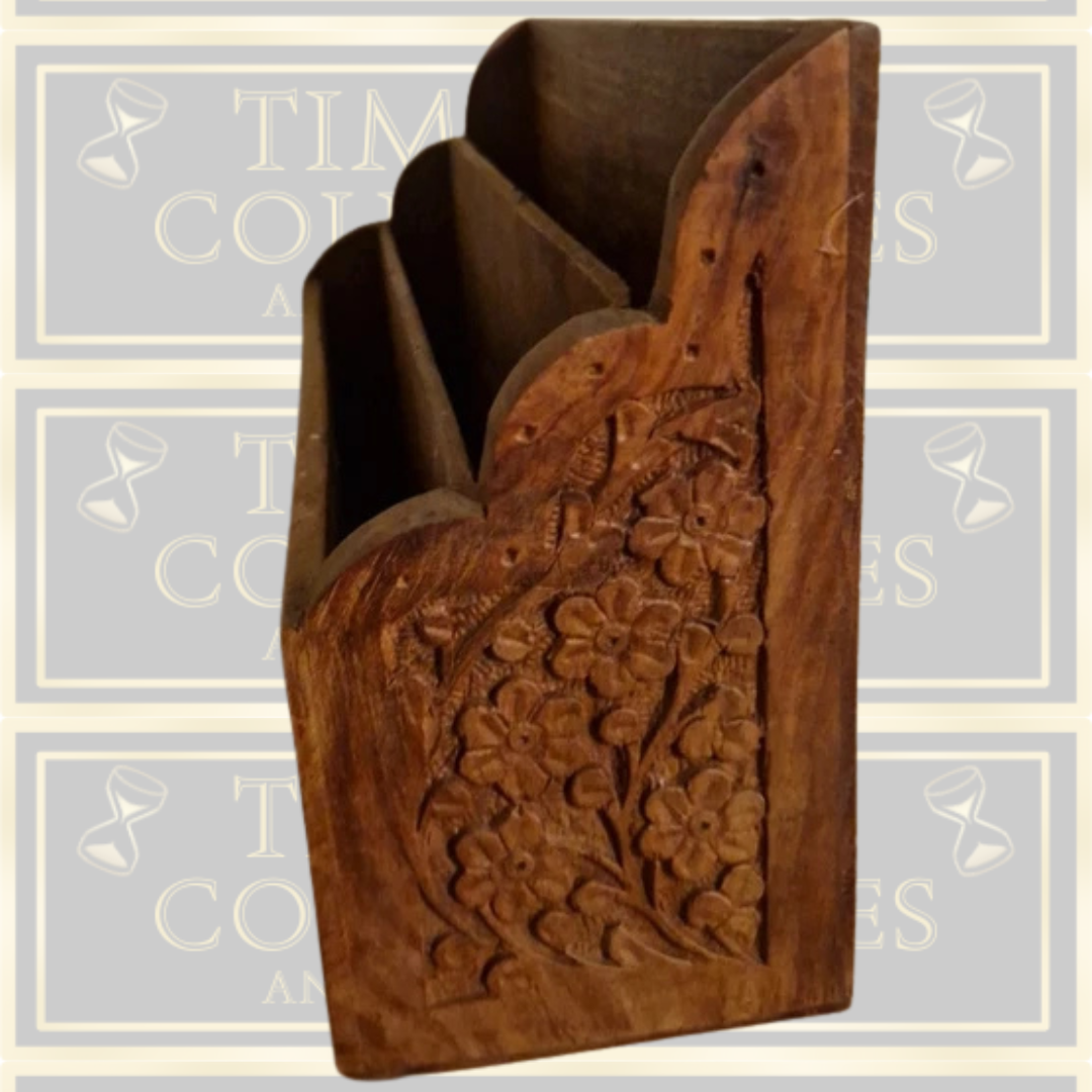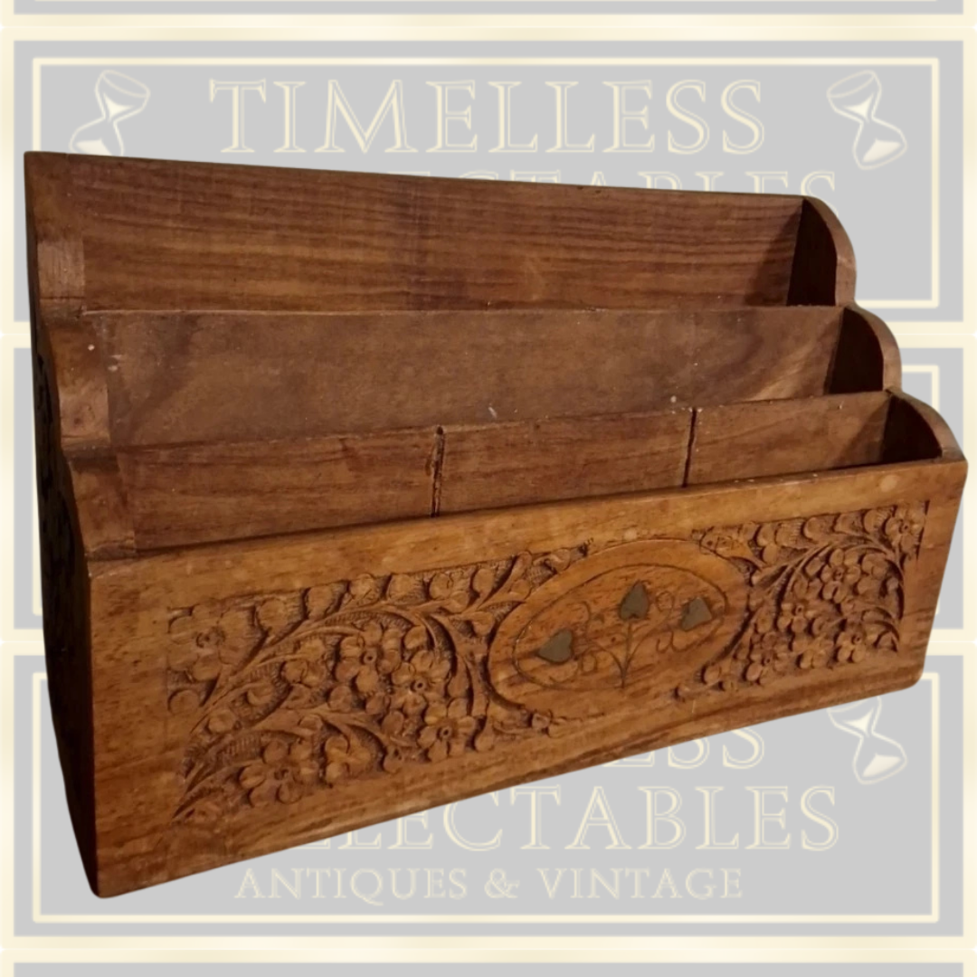 Antique Arts And Crafts Hand Carved Letter Rack with Brass Inlay