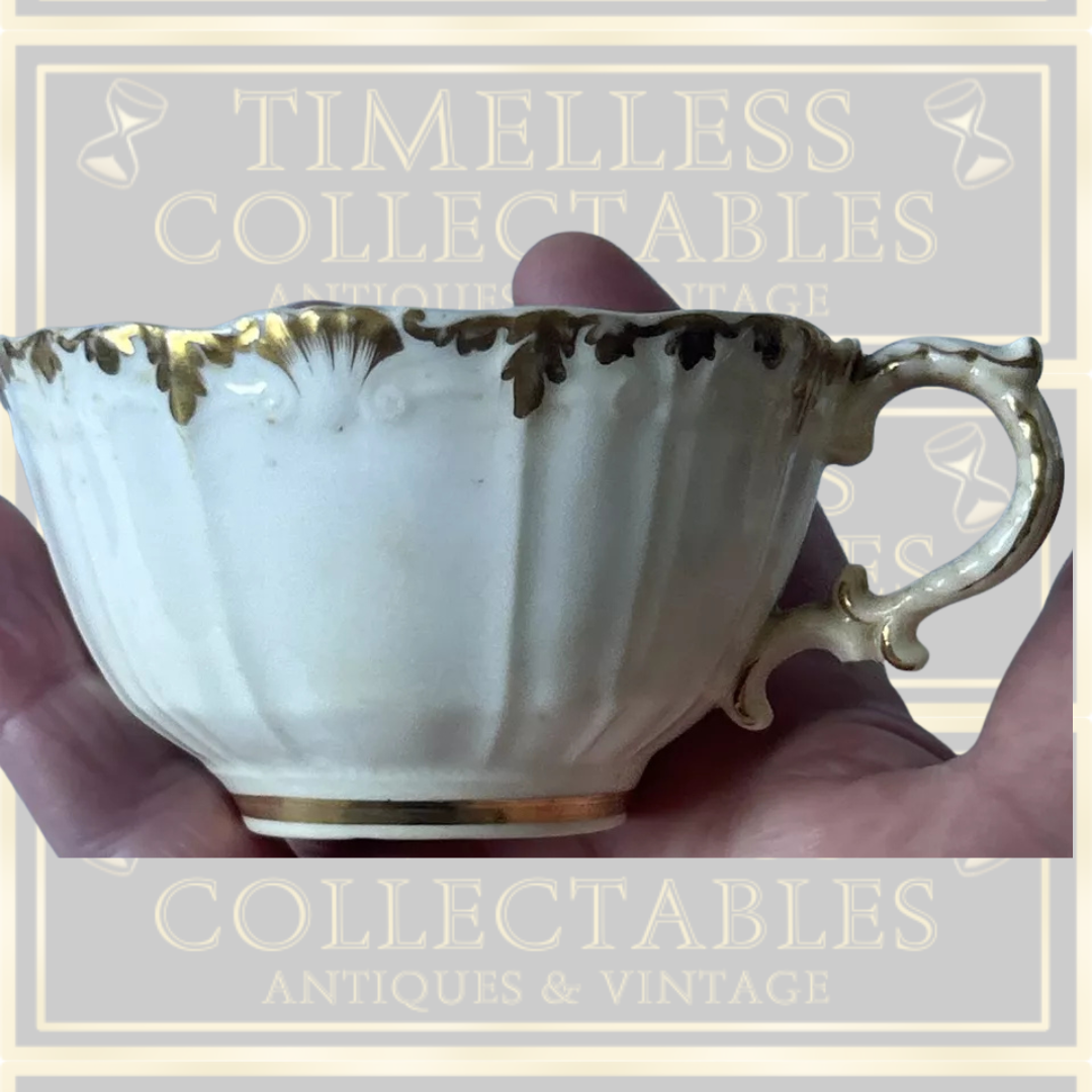 This antique English H R Daniel tea cup is a distinctive collector’s piece, featuring detailed scenes of a castle and cottage inside the tea cup, accented with gold gilding along the exterior and edges. It bears visible signs of wear, including a hairline crack and slight blemishes on the handle as shown. Although we generally refrain from offering items with imperfections, the rarity of this cup justifies its availability for discerning enthusiasts.