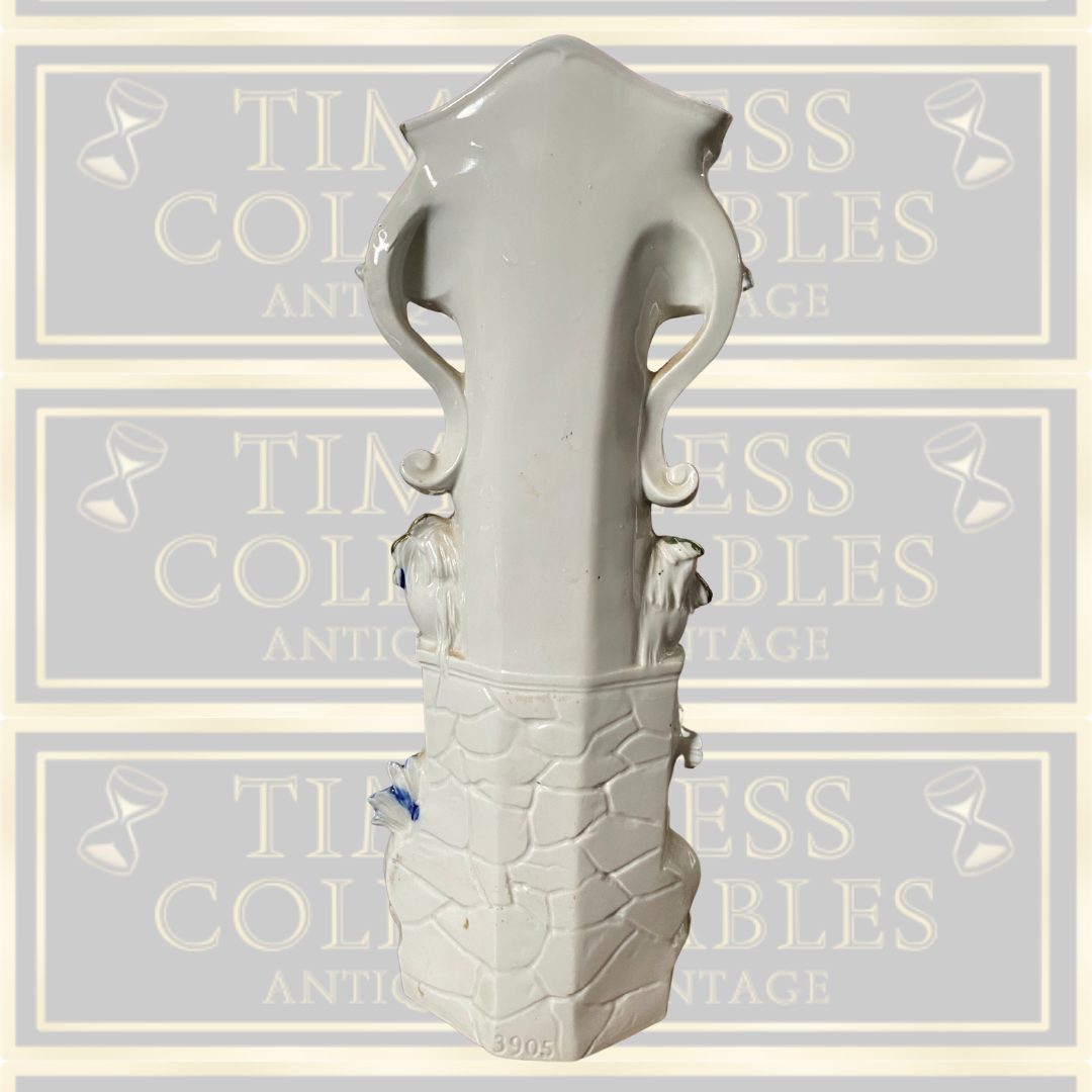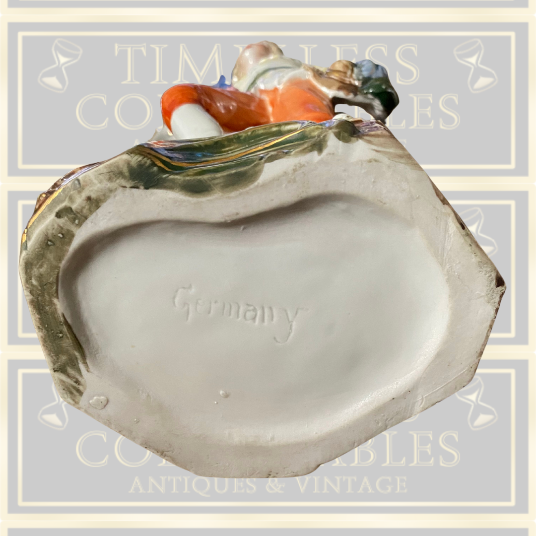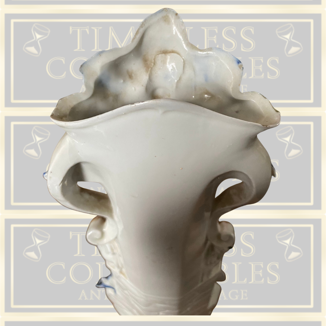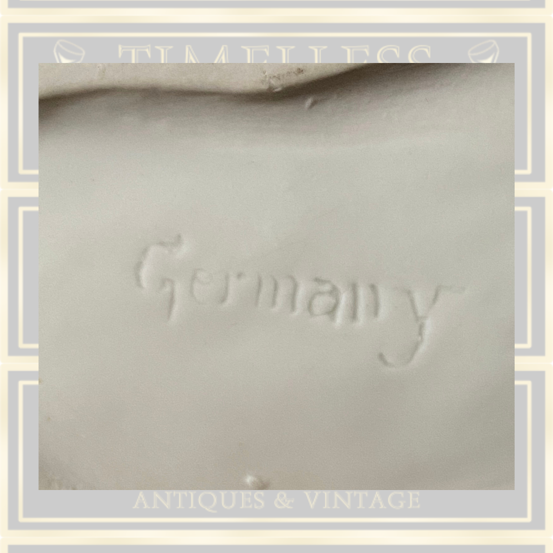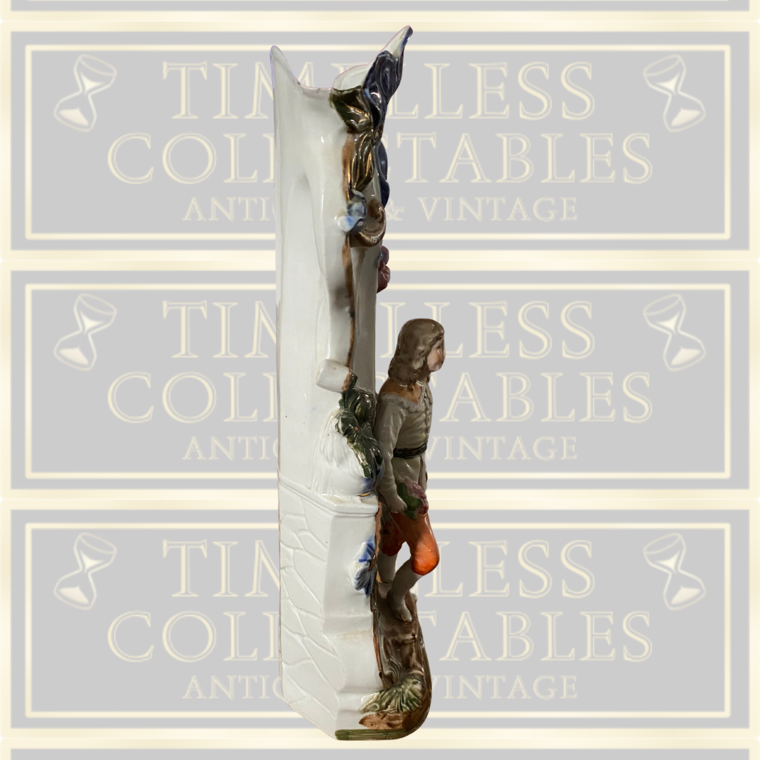 This piece features a male figure standing on a base with integrated floral elements and a large blue flower forms the top of the vase. The intricate details, hand-painted elements, and use of gold accents are characteristic of European porcelain manufacturers, I believe this to be an early meissen piece or similar to Meissen, known for their high-quality figurines and decorative wares. The vase is marked Germany on the base and has the numbers 3905 on the back. The vase measures approximately 13" high and 5" wide and has a depth of approximately 4" This item is in an overall good vintage pre-loved condition. Some dust and dirt has gathered to the interior and exterior of the vase so it will require a careful and gentle clean. There are two small chips to the steps at the front of the vase, there is also some slight paint wear around the base. Some light crazing to the back of the vase