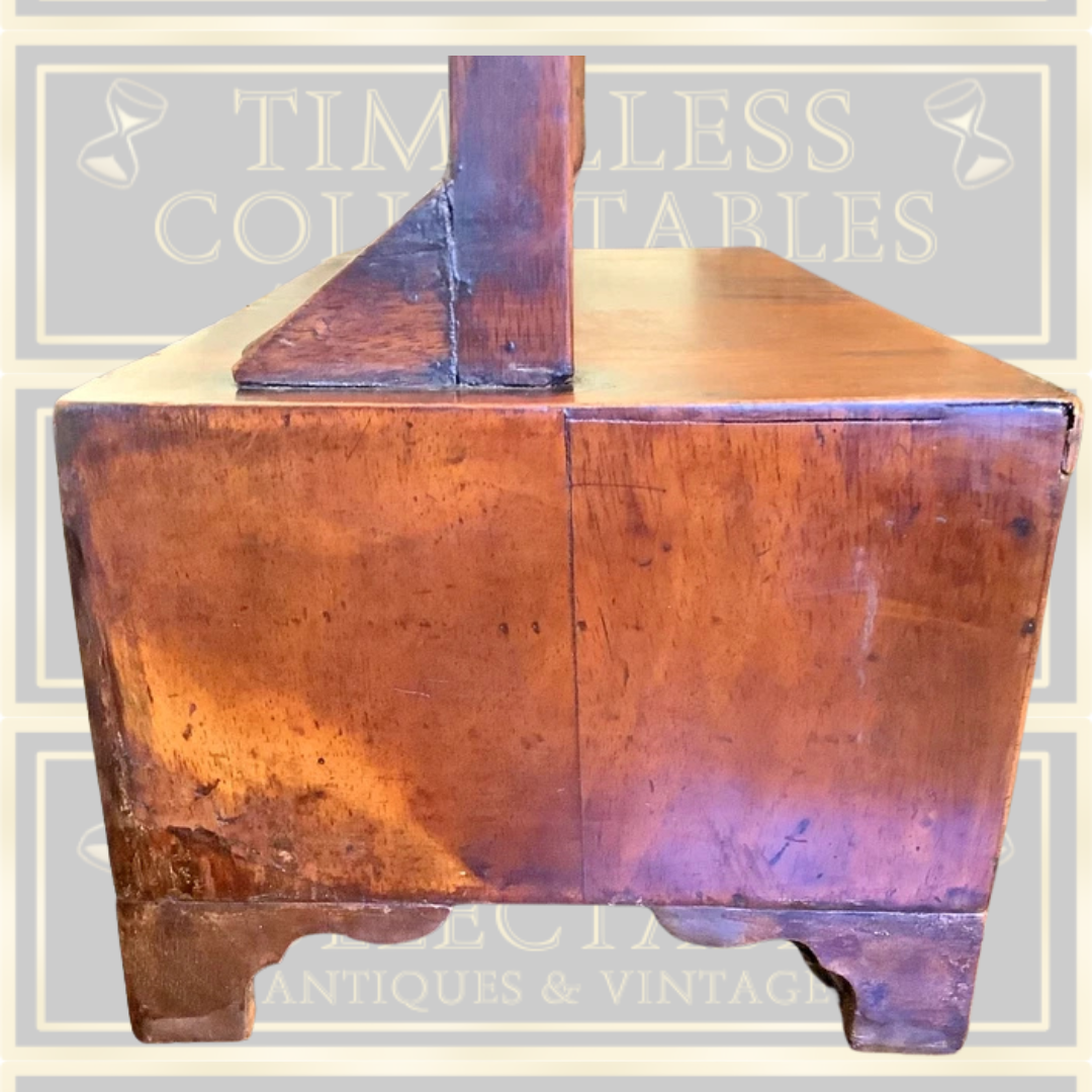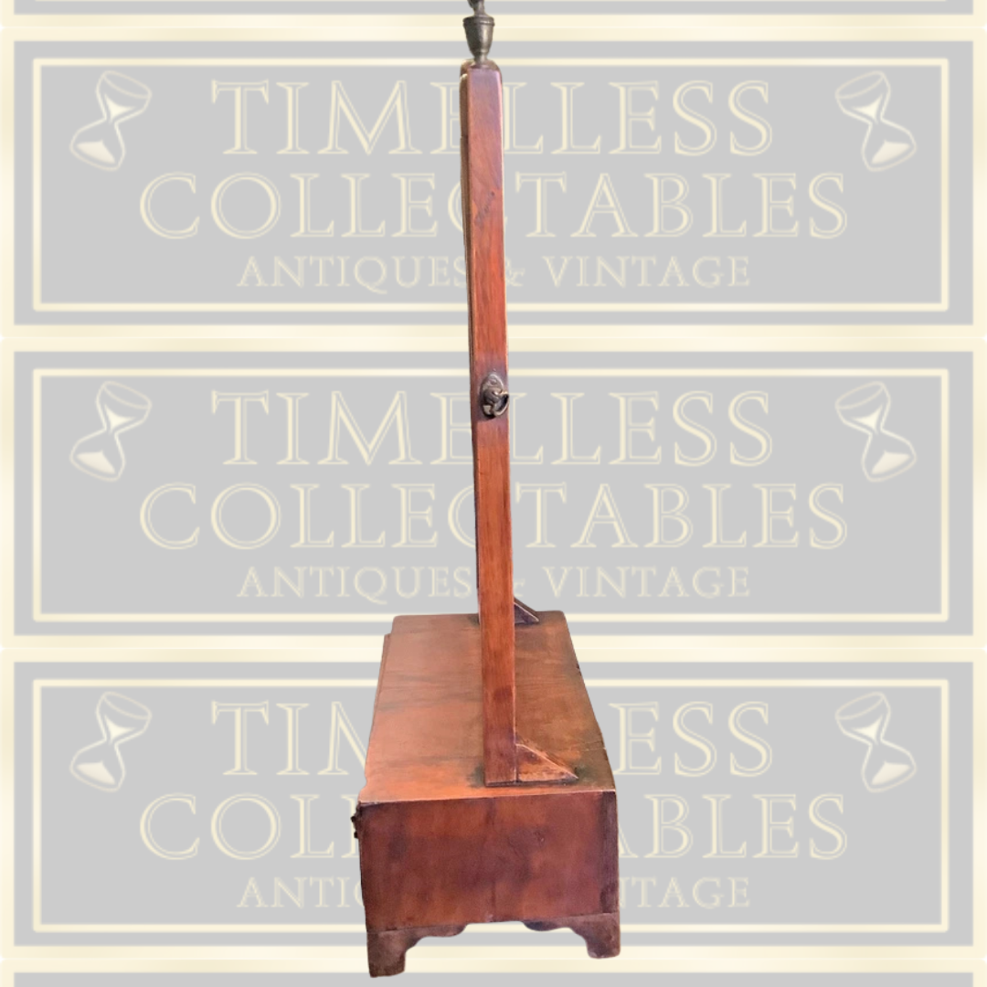 This elegant mahogany mirror exemplifies mid-18th century craftsmanship, circa 1750. The piece features a rectangular mirror plate mounted on tapered square uprights with swivel screws, allowing adjustable positioning. A single drawer with dovetailed construction houses original Georgian shield drop handles and retains its period pinkish lining. The solid mahogany and pine carcass rests on bracket feet with a panelled back board. The veneer shows fair patina consistent with age, whilst the mirror plate displays characteristic haziness typical of period glass. The structure remains sound and stable, presenting an authentic example of Georgian domestic furniture with genuine period hardware and construction details.