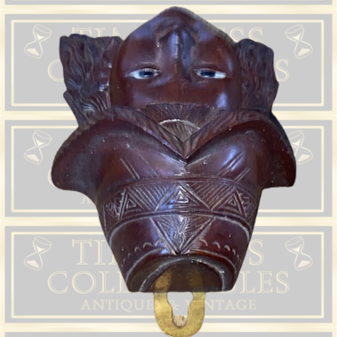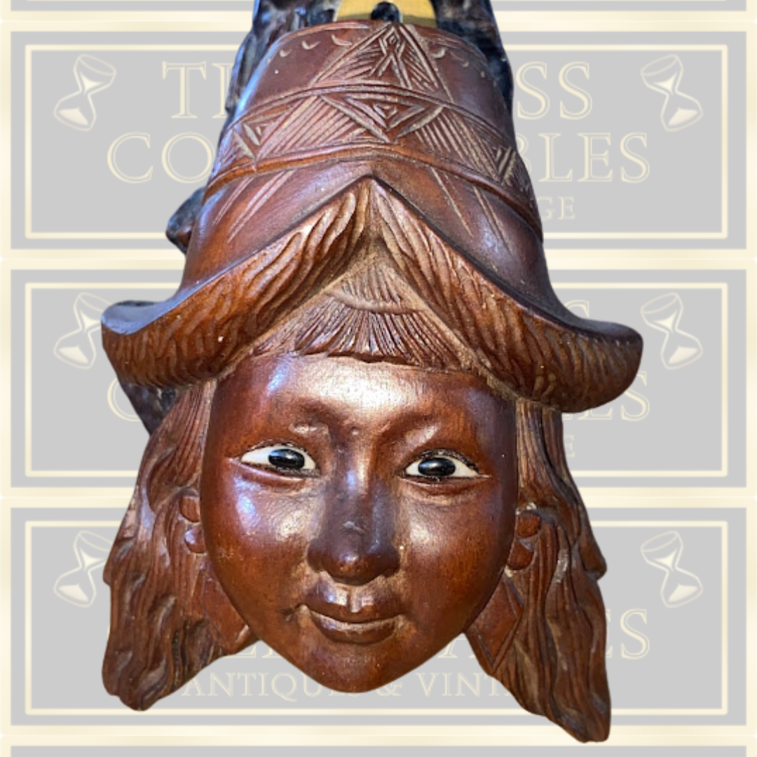 19th-century Chinese mask exemplifies the refined craftsmanship of its era, carved entirely from premium rosewood by skilled artisans. The intricate detailing showcases traditional techniques, with each feature precisely rendered to capture expressive character. Fashioned from a single piece of wood, this miniature sculpture demonstrates the patience and expertise required for such delicate work. Its compact size makes it an ideal display piece for collectors seeking authentic examples of classical Chinese woodcarving. Ready to hang, Roughly 6 inches