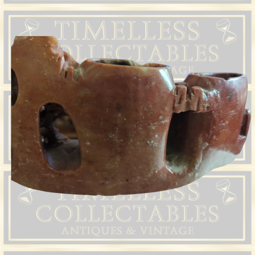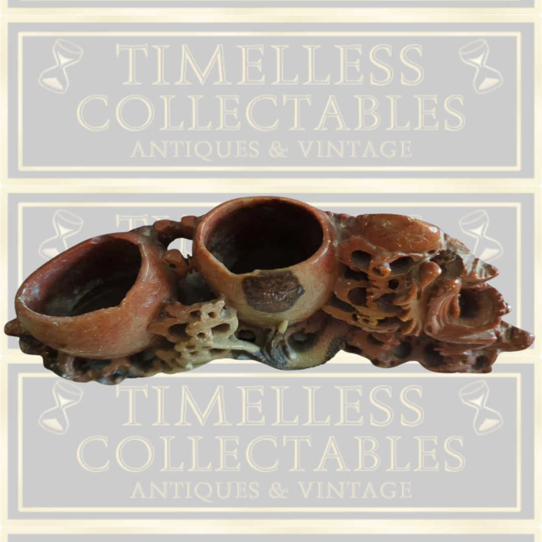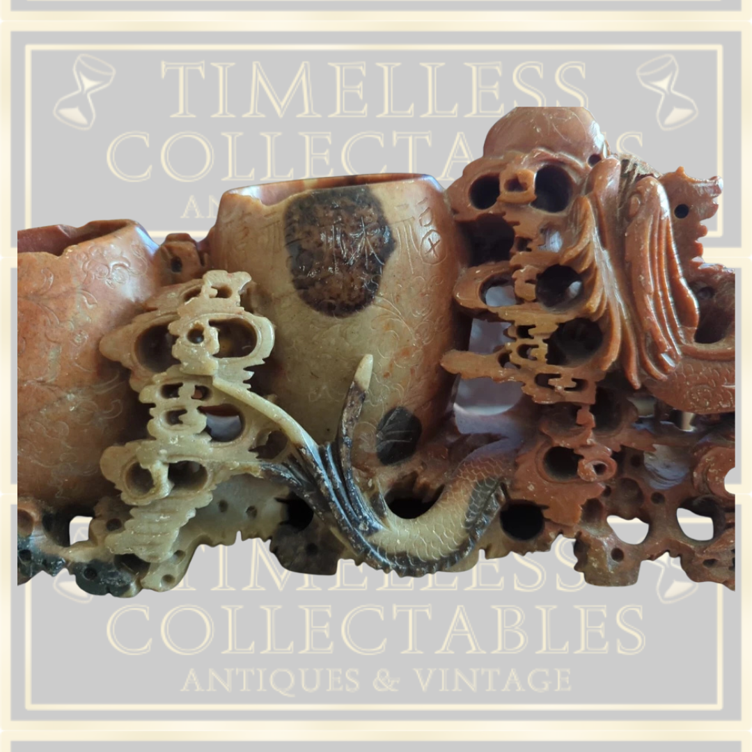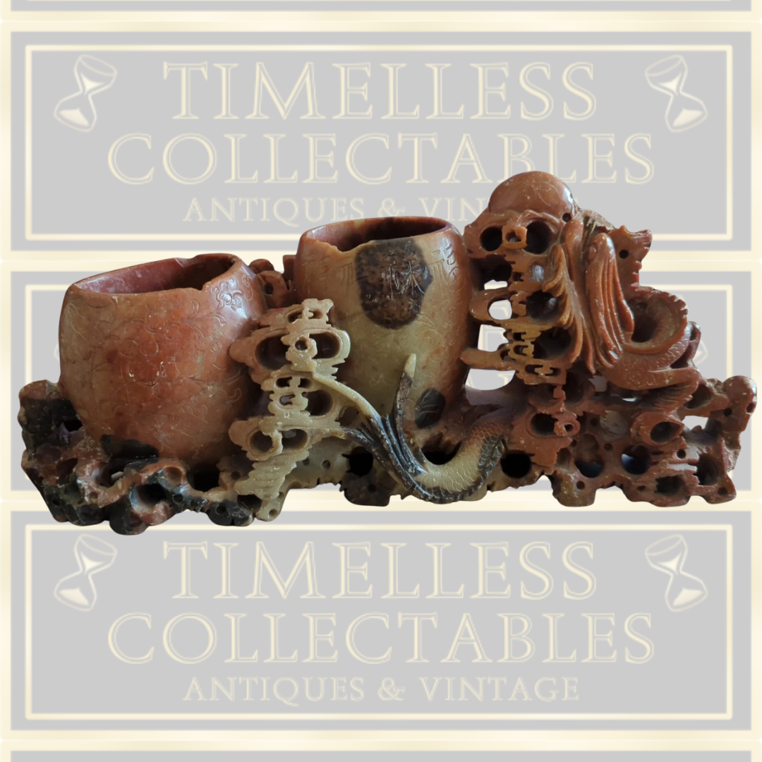 This Antique Chinese Soapstone carving measures approximately 5 inches in height and 11 inches in length. Visible in the images are some chips along the edges and a chip on one side decoration. But for the age its in good condition, The base features a signature and carved Chinese characters on one of the pots though the signature is difficult to decipher. This piece serves beautifully as an elegant desktop stationery holder or a sturdy brush pot with historical character.