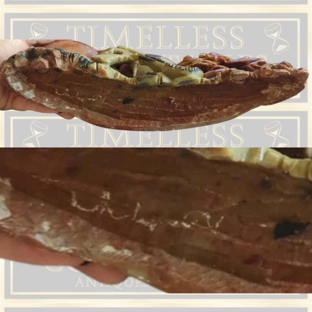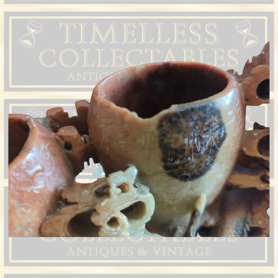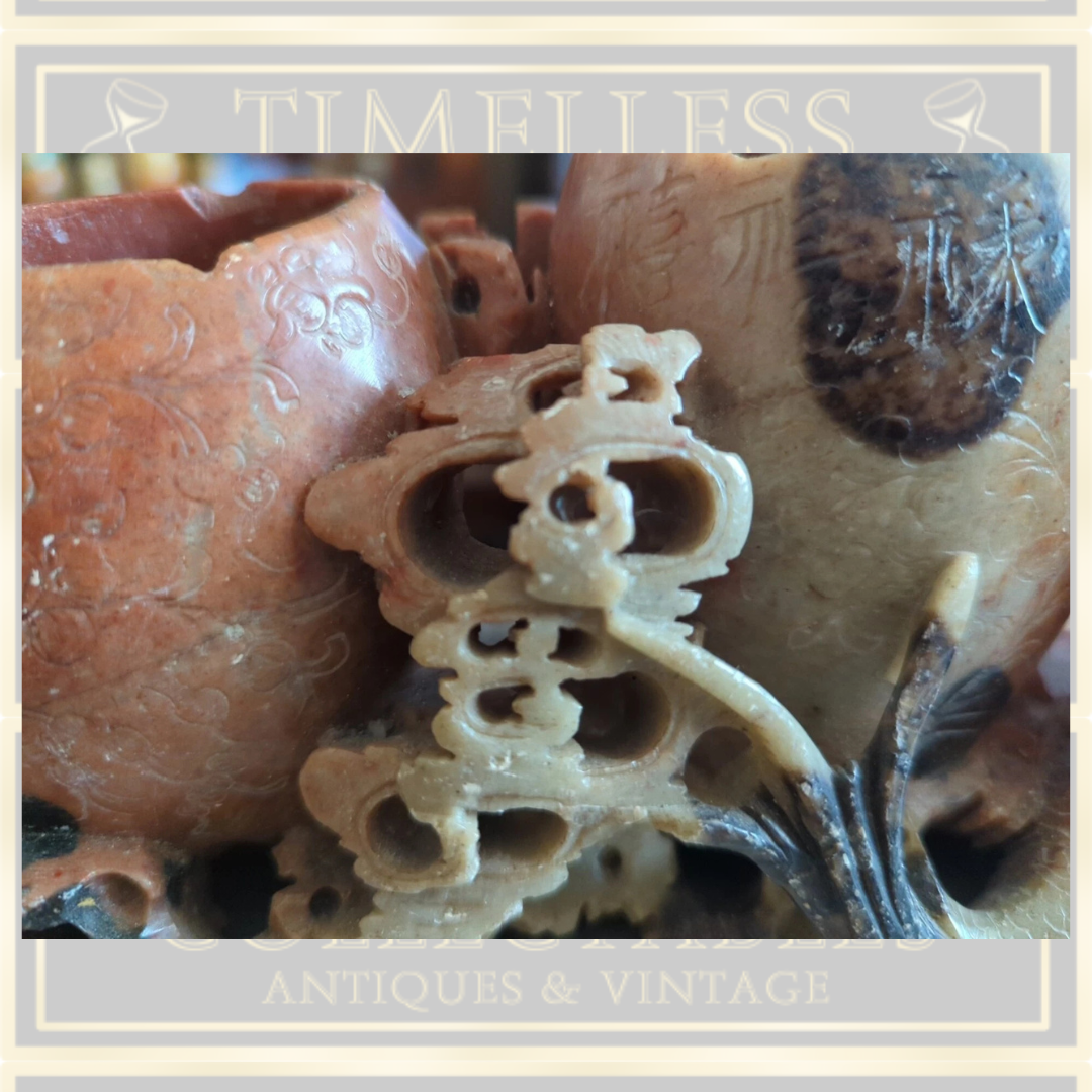 This Antique Chinese Soapstone carving measures approximately 5 inches in height and 11 inches in length. Visible in the images are some chips along the edges and a chip on one side decoration. But for the age its in good condition, The base features a signature and carved Chinese characters on one of the pots though the signature is difficult to decipher. This piece serves beautifully as an elegant desktop stationery holder or a sturdy brush pot with historical character.