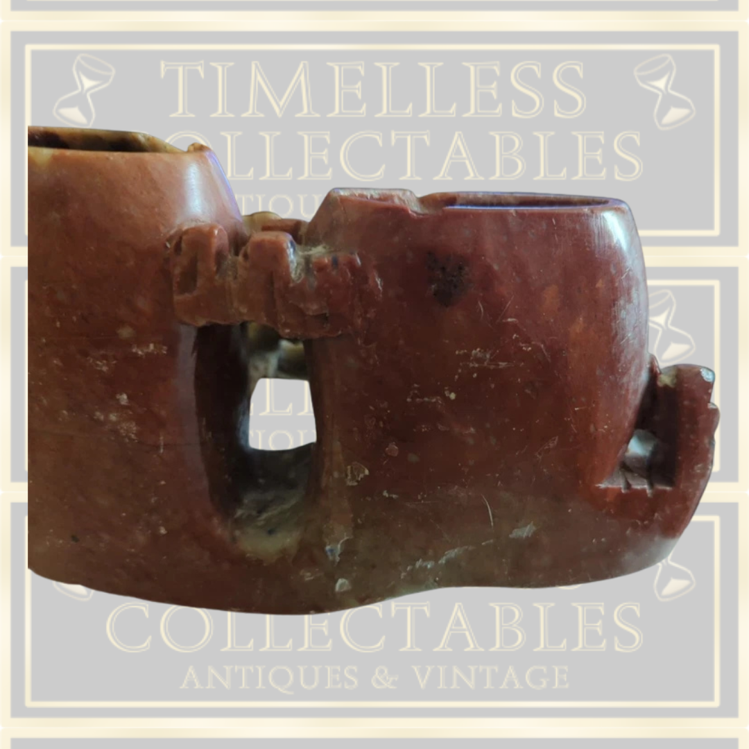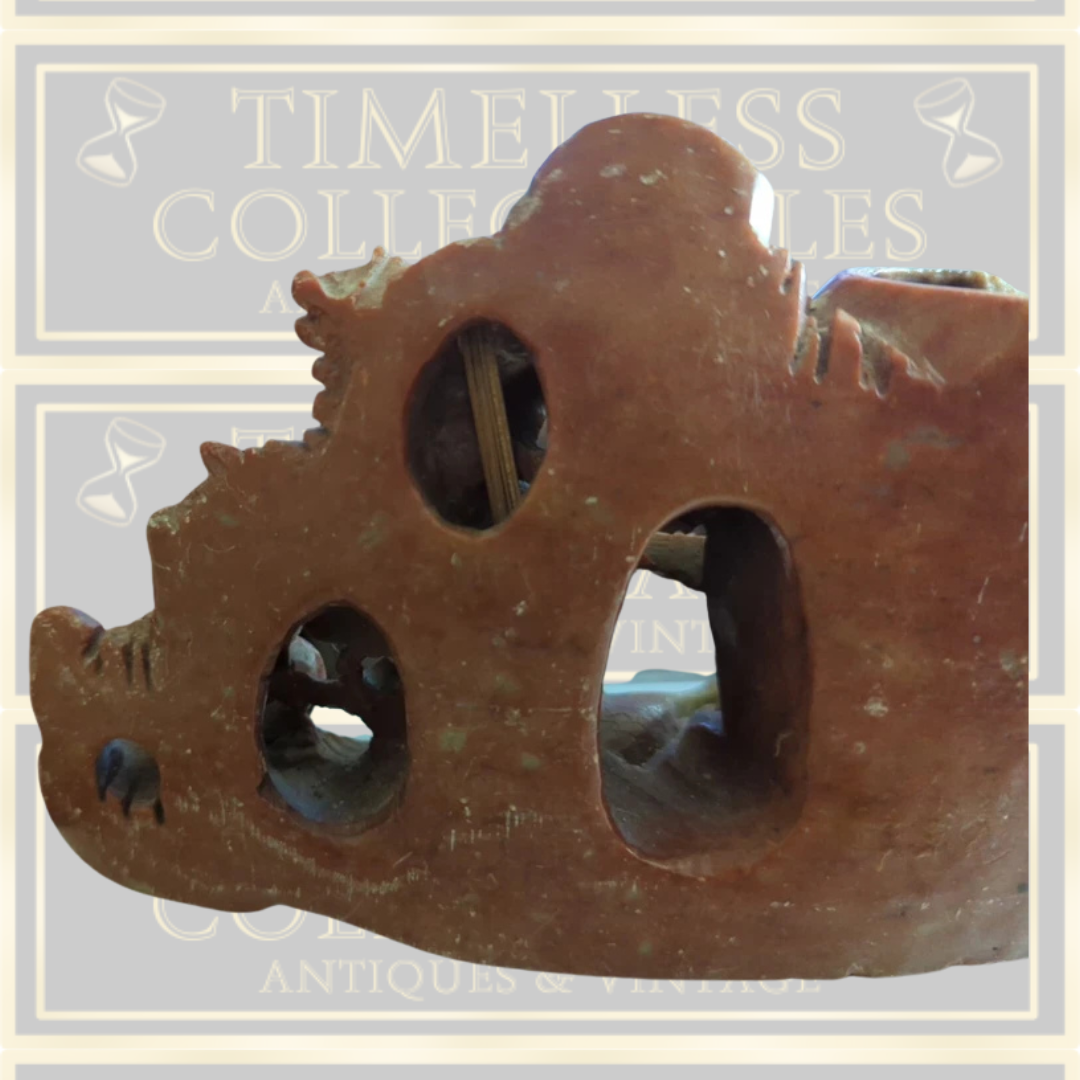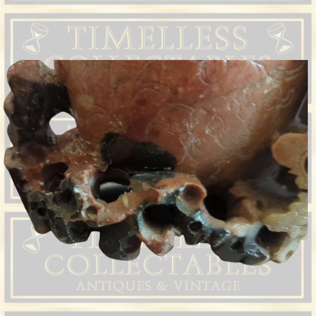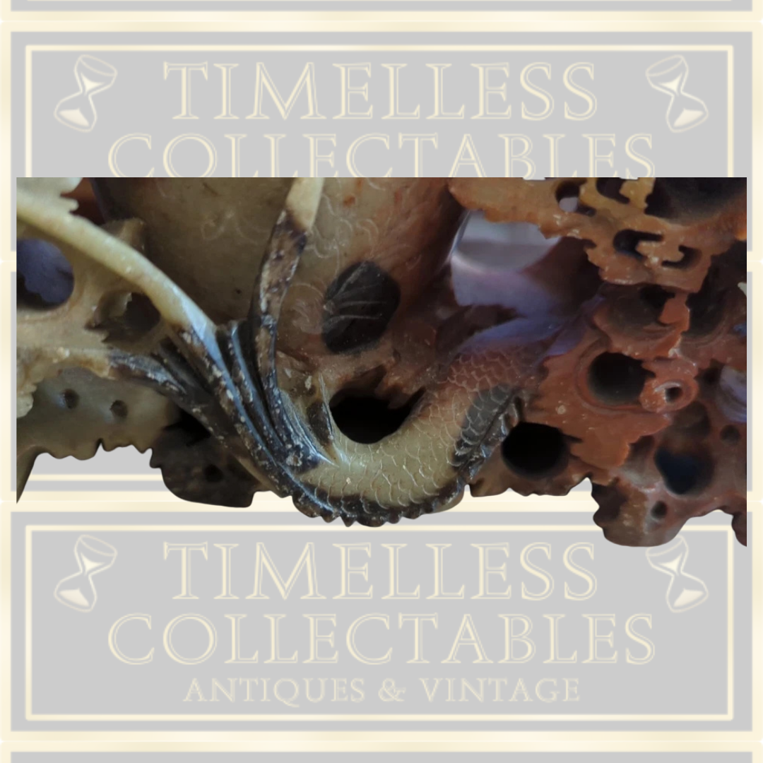 This Antique Chinese Soapstone carving measures approximately 5 inches in height and 11 inches in length. Visible in the images are some chips along the edges and a chip on one side decoration. But for the age its in good condition, The base features a signature and carved Chinese characters on one of the pots though the signature is difficult to decipher. This piece serves beautifully as an elegant desktop stationery holder or a sturdy brush pot with historical character.