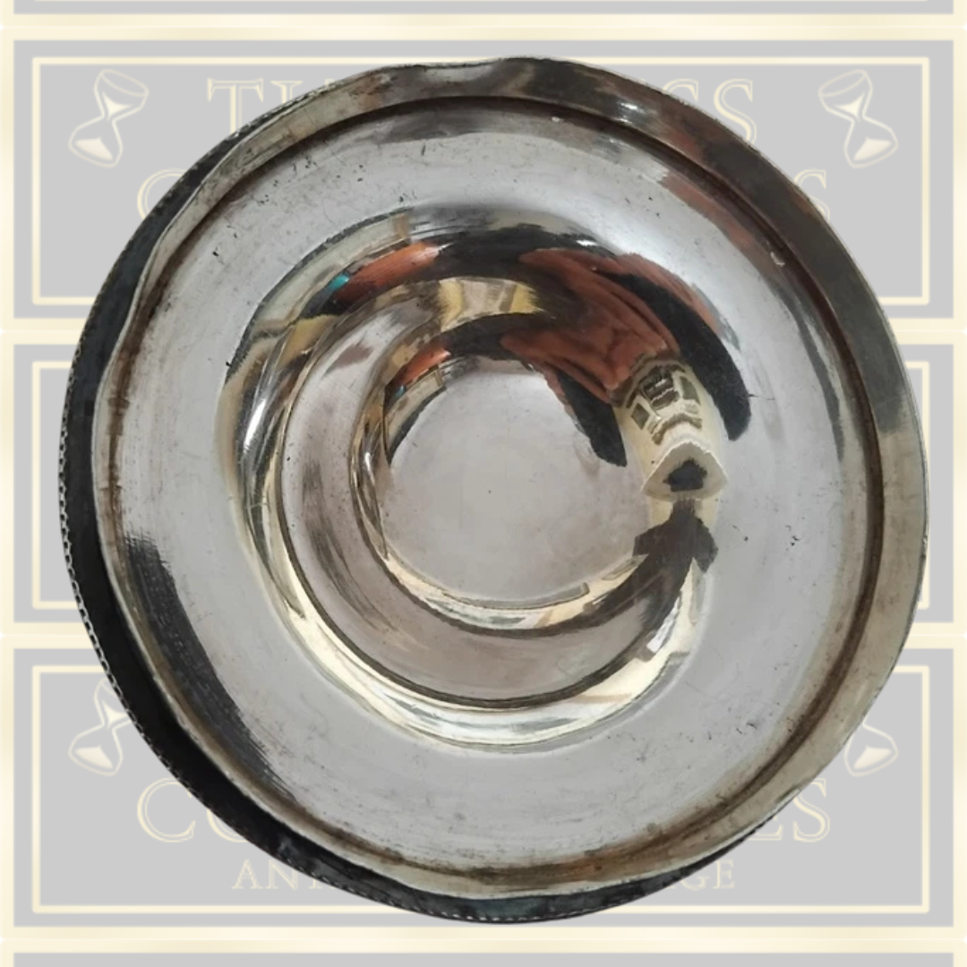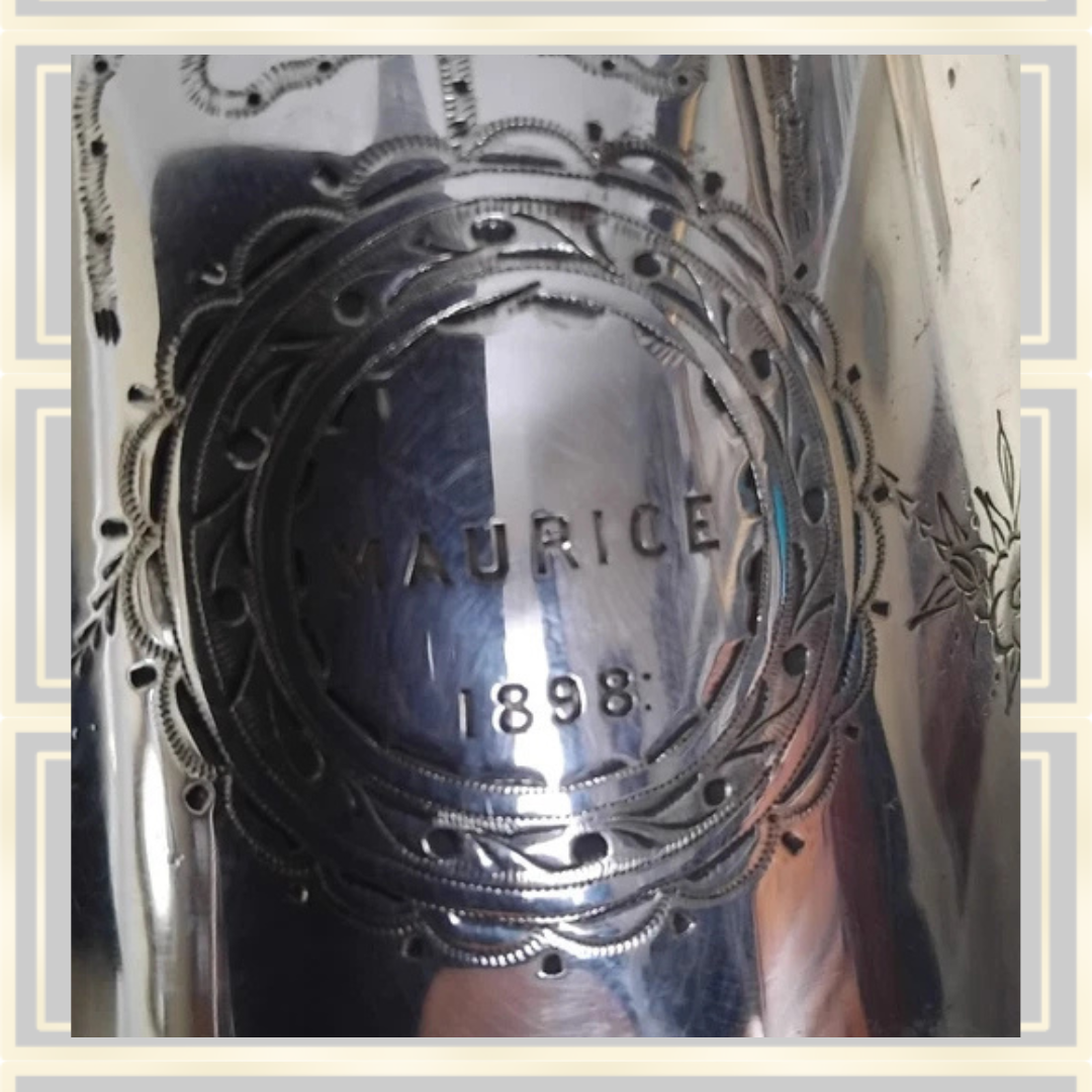This Antique Victorian Silver Plated Tea Caddy features an exquisite oval engraving with the name Maurice dated 1898 on the front. Though it originally included an insert, it is currently missing but can be replaced with relative ease. The piece shows minor dents typical of regular use, yet the detailed gadrooning remains exceptional. Measuring approximately 6 by 5 inches, it stands as a remarkable example of period craftsmanship.