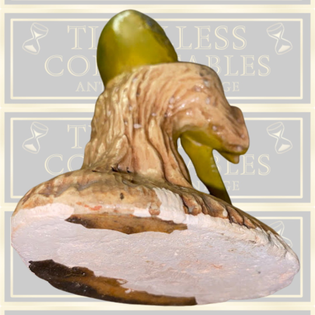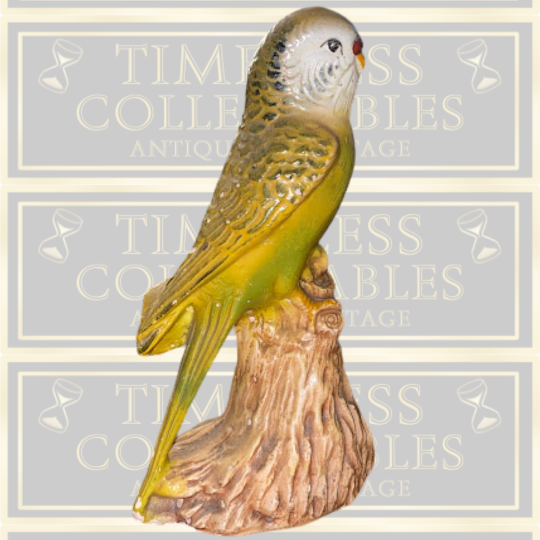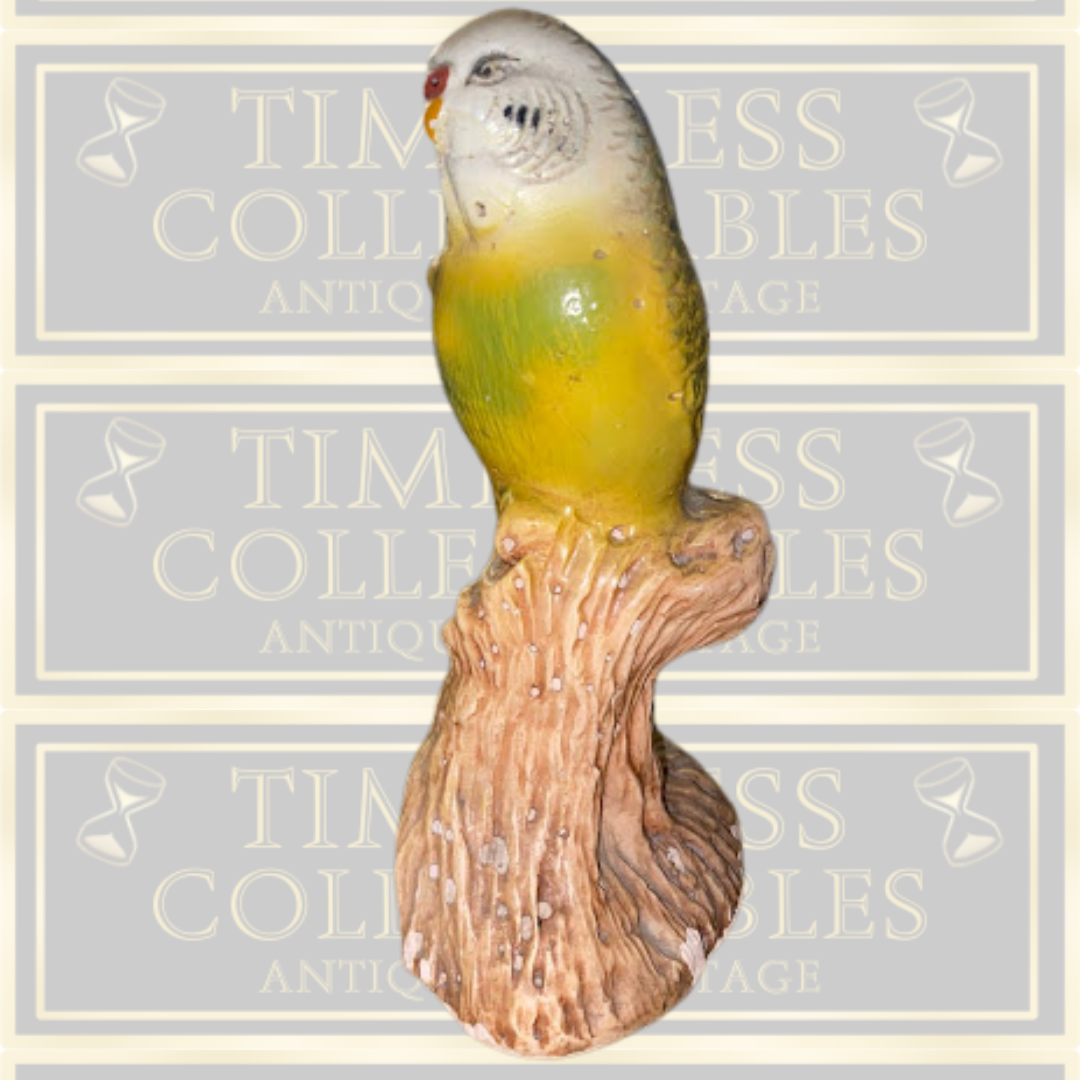 This charming vintage budgie ornament exemplifies the refined craftsmanship of its era. Hand-finished with meticulous attention to detail, it serves as a distinguished focal point for discerning collectors. The piece's authentic patina and construction speak to its provenance, making it a worthy investment for those who appreciate genuine antique treasures. Display it prominently to showcase your appreciation for quality decorative arts and timeless design. We think its made of plaster i am sure the base is plaster unsure of the actual bird