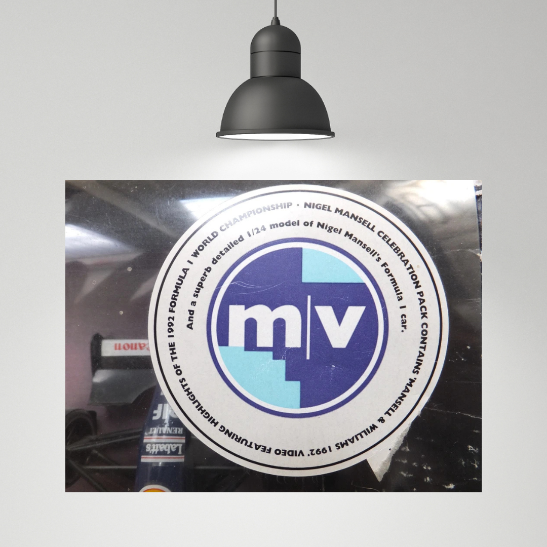 This vintage 1992 Nigel Mansell Celebration Pack includes a die-cast 1/24 scale Williams FW14 car and a VHS video. The car remains securely fastened inside its original case, never removed. The condition of the VHS tape’s usage is unknown. The pack is enclosed in a thin plastic sleeve, which shows some surface scratches and minor wear on the back.
