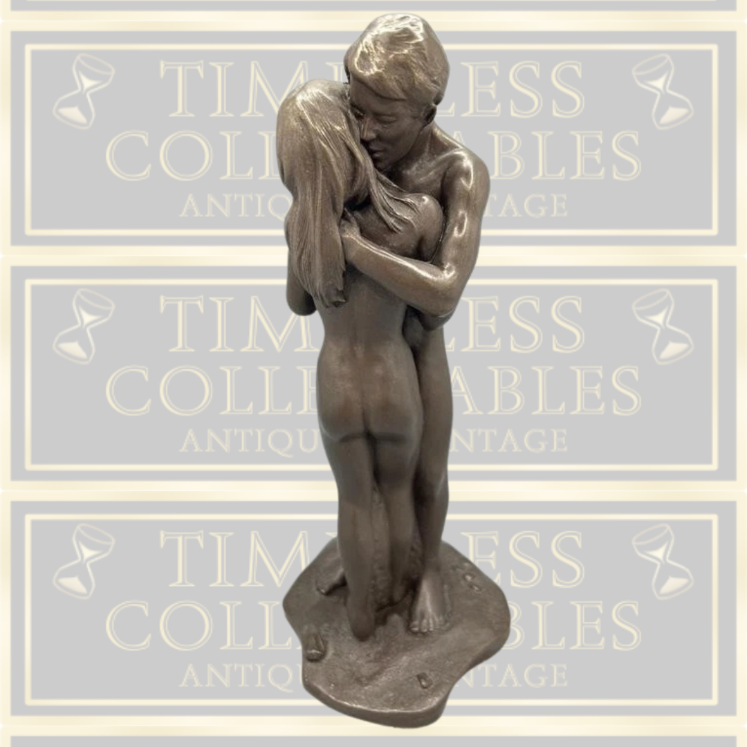 A distinguished bronze-cast representation of Adam and Eve, this classical sculpture captures an intimate moment between the figures in elegant embrace. Crafted with meticulous attention to form and detail, the piece exemplifies timeless artistic tradition. Ideal for collectors of classical mythology and fine decorative arts, this ornamental figurine serves as a sophisticated addition to any curated collection or display space. Great condition apart from the felt at the bottom is a little worn confirming to be original vintage condition.