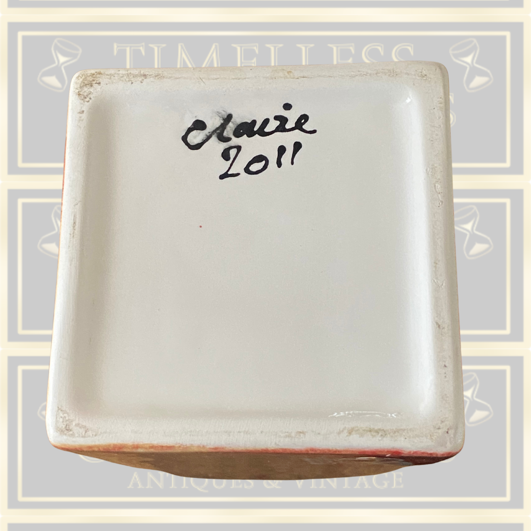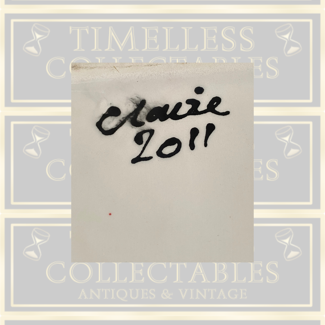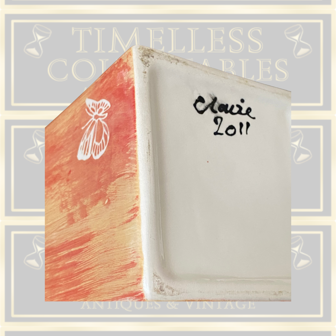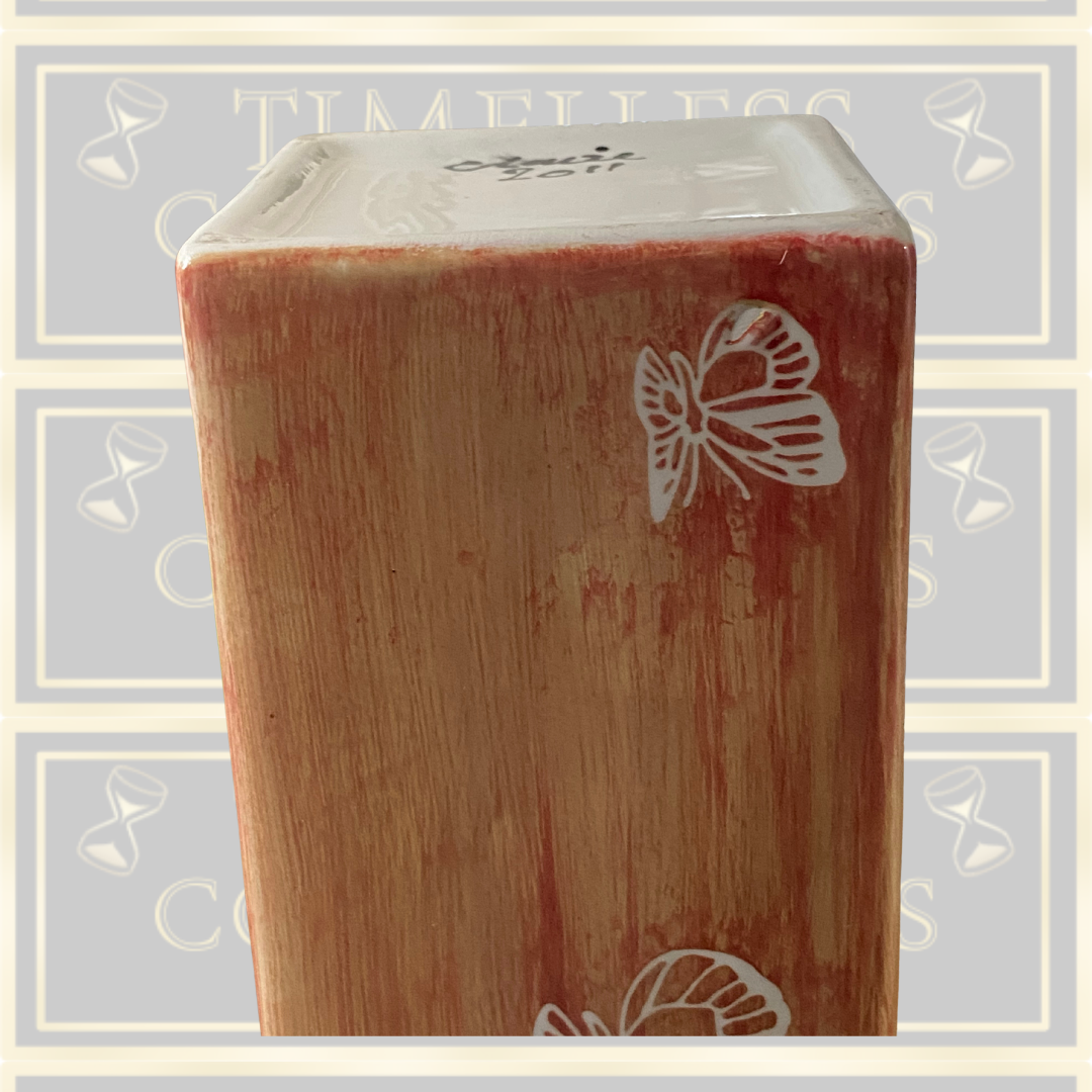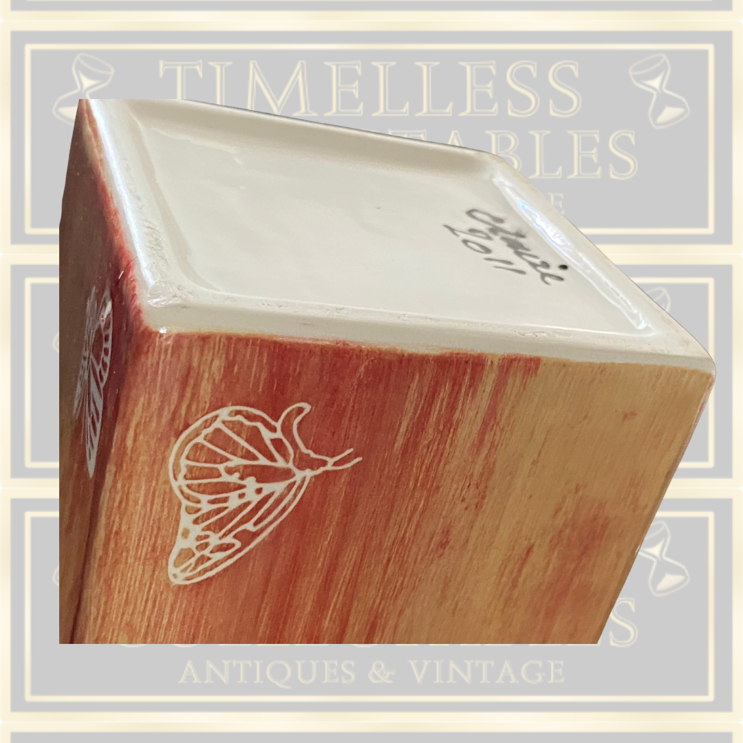 This signed studio pottery butterfly vase, crafted by Claire in 2011, showcases exceptional artistry and attention to detail. The vase features a delicate brushed peachy orange glaze both inside and out, creating a warm and inviting tone. Adorned with intricately designed butterflies, each element highlights the skillful handwork typical of fine studio pottery. This piece not only serves as a functional vessel but also as a captivating decorative object, perfect for collectors who appreciate unique, signed ceramics with a refined aesthetic.