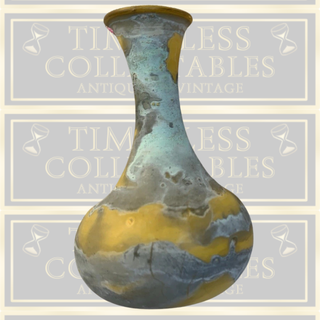 This vintage small glass vase from A & K Yaghmour, Jerusalem, features a mouth-blown construction and hand-painted yellow and grey marbled design. Remains in good vintage condition, making it an elegant and distinctive decorative piece.