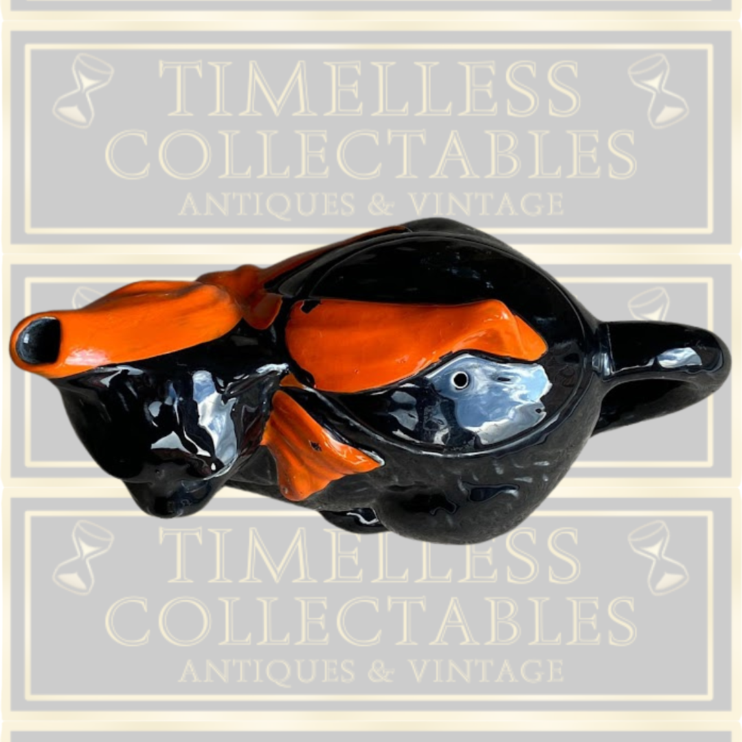 This Vintage Art Deco Crown Ducal Black Cat Teapot showcases a distinctive black and orange color scheme, emblematic of the Art Deco era. The teapot features enamel chipping. Its unique design makes it an excellent collectible piece, especially suited for Halloween-themed displays or as a conversation starter in any collection. Crafted with the quality Crown Ducal is known for, this teapot combines both artistic charm and historical value for discerning collectors.