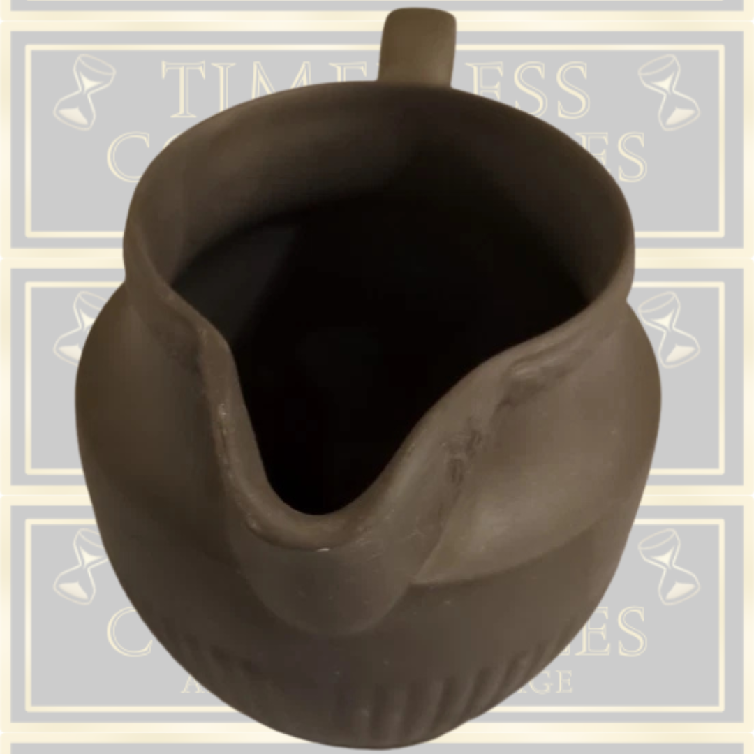 This striking Wedgwood black basalt pitcher exemplifies the refined elegance of 18th-century neoclassical design. Standing at 4.5 inches, the vessel features the signature fluted detailing characteristic of the pottery's most coveted pieces. The matte black ceramic finish demonstrates the technical mastery Wedgwood achieved with their distinctive basalt body—a durable stoneware that has endured centuries of collecting. Its understated monochromatic aesthetic seamlessly complements both period interiors and modern décor, making it a versatile addition to any serious collection. Authenticated examples bear the impressed Wedgwood mark on the base, confirming provenance and quality craftsmanship. Just like this one