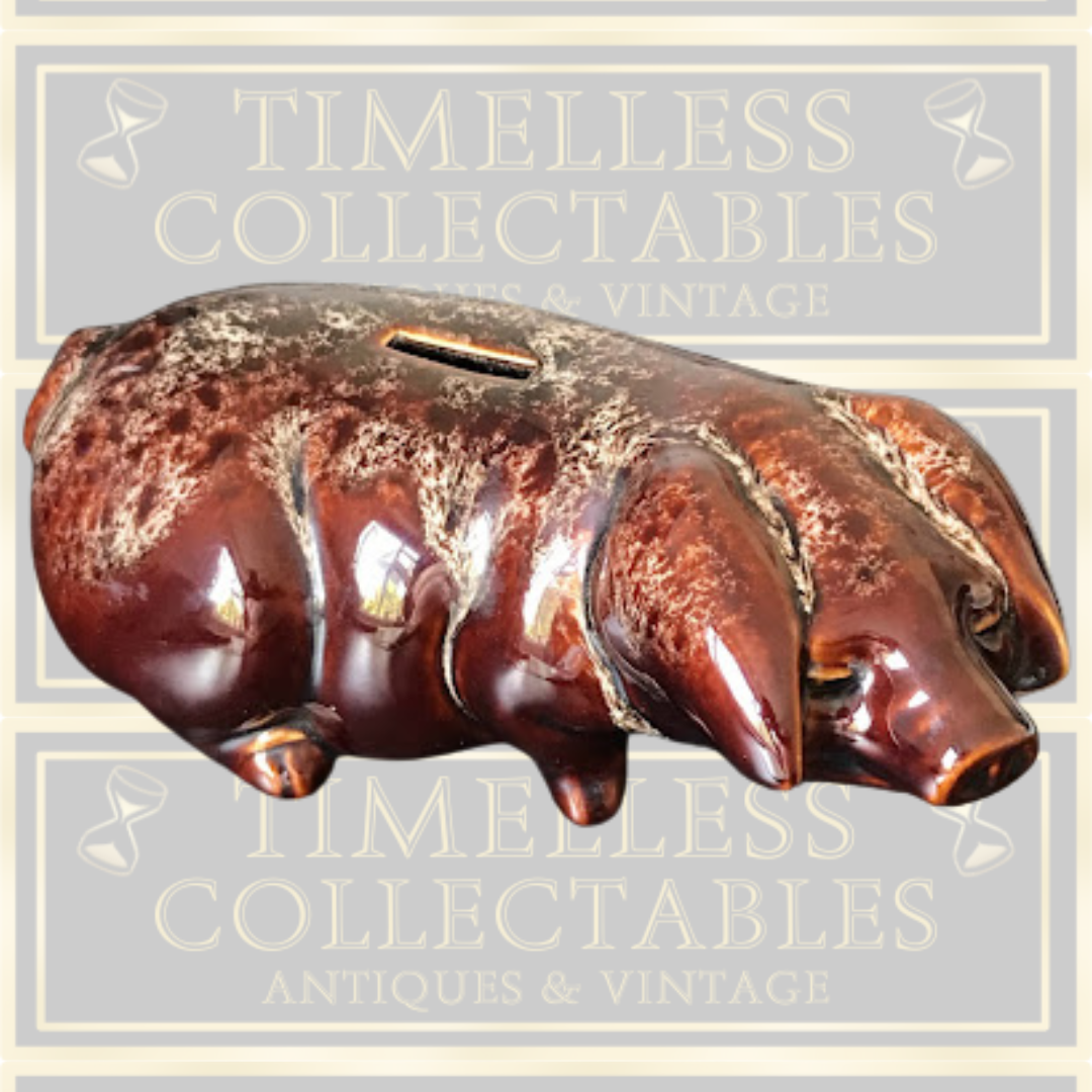 This large vintage piggy bank from Kernewek Studio Pottery, Cornwall, features a charming pig figure with a distinctive honeycomb glaze. Measuring approximately 25cm in length and 10cm in height, it remains in excellent condition for its age, free from chips, cracks, or crazing. A collectible piece combining functionality and classic pottery craftsmanship.