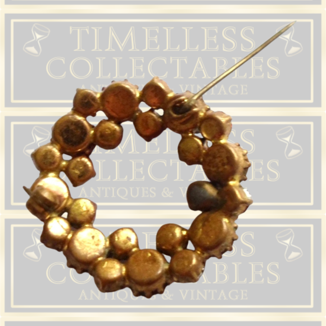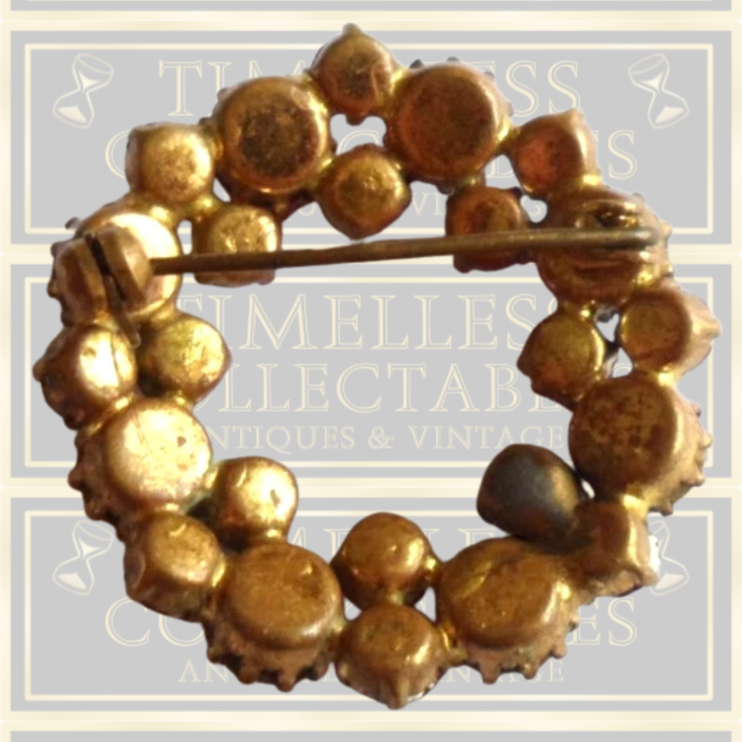 This vintage brooch features a claw setting adorned with vibrant red stones alongside iridescent Aurora Borealis stones. It is equipped with a rollover catch and is in good condition, showing minor wear on the gold-toned metal back consistent with regular use. The piece measures approximately 3.2 cm (1 1/4") in diameter and weighs around 6.5 grams.