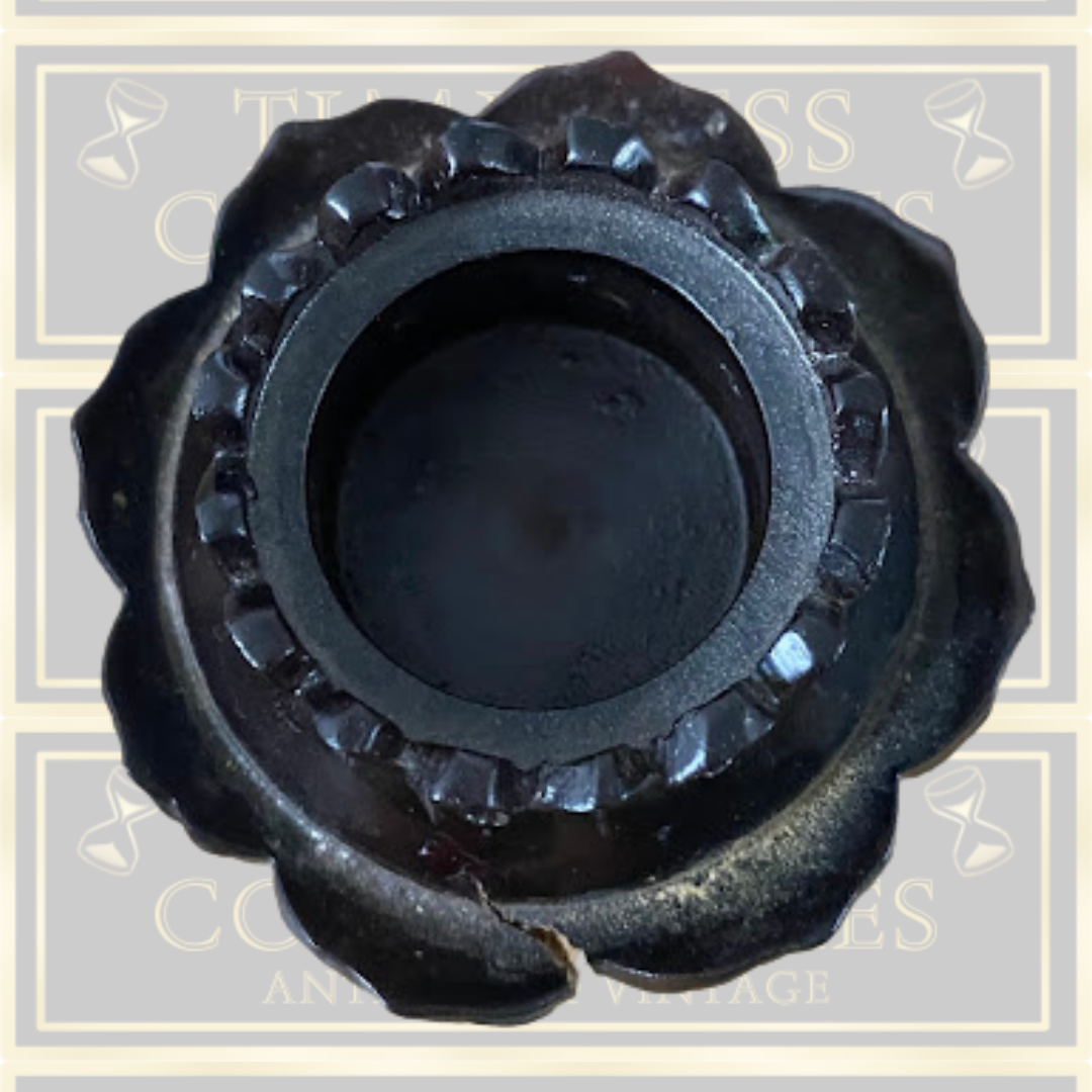 Expertly crafted from solid local ebony hardwood, this vintage incense burner features detailed carvings of a Buddha hand and lotus flower, showcasing natural wood grain and color. Ideal for meditation and relaxation, it serves as an elegant Buddhist ornament and enhances any Zen-inspired space. slight crack to flower base