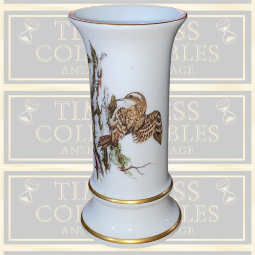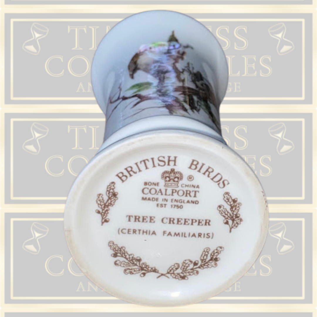 Vintage Coalport porcelain artistry, this vintage bone china vase presents a meticulously hand-painted Tree Creeper bird rendered in the refined style for which the manufactory was renowned. The composition is enhanced by graceful gold bands encircling both the neck and foot, lending an air of sophistication to the piece. The maker's mark impressed upon the base authenticates its heritage and affirms the quality standards upheld by this esteemed British porcelain house