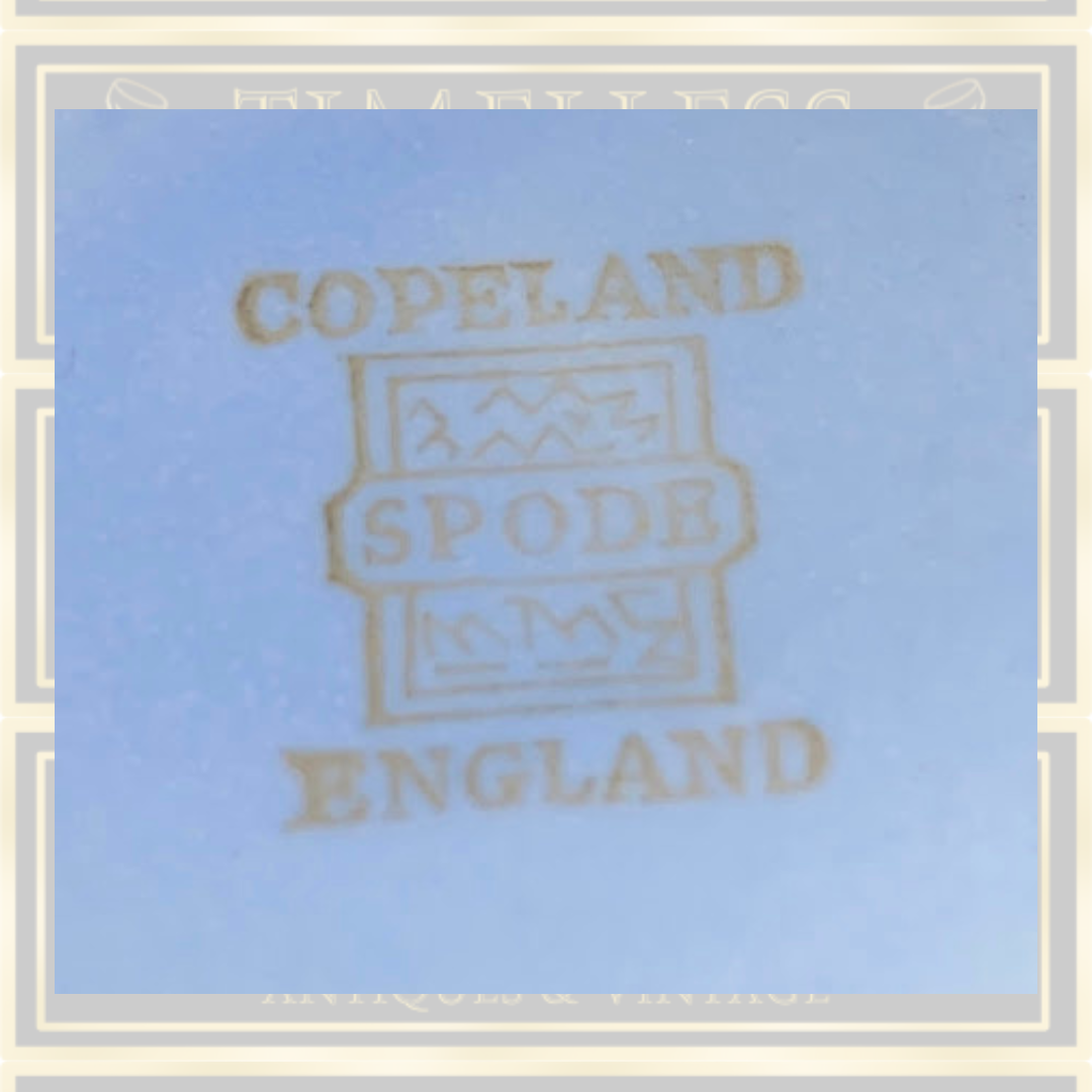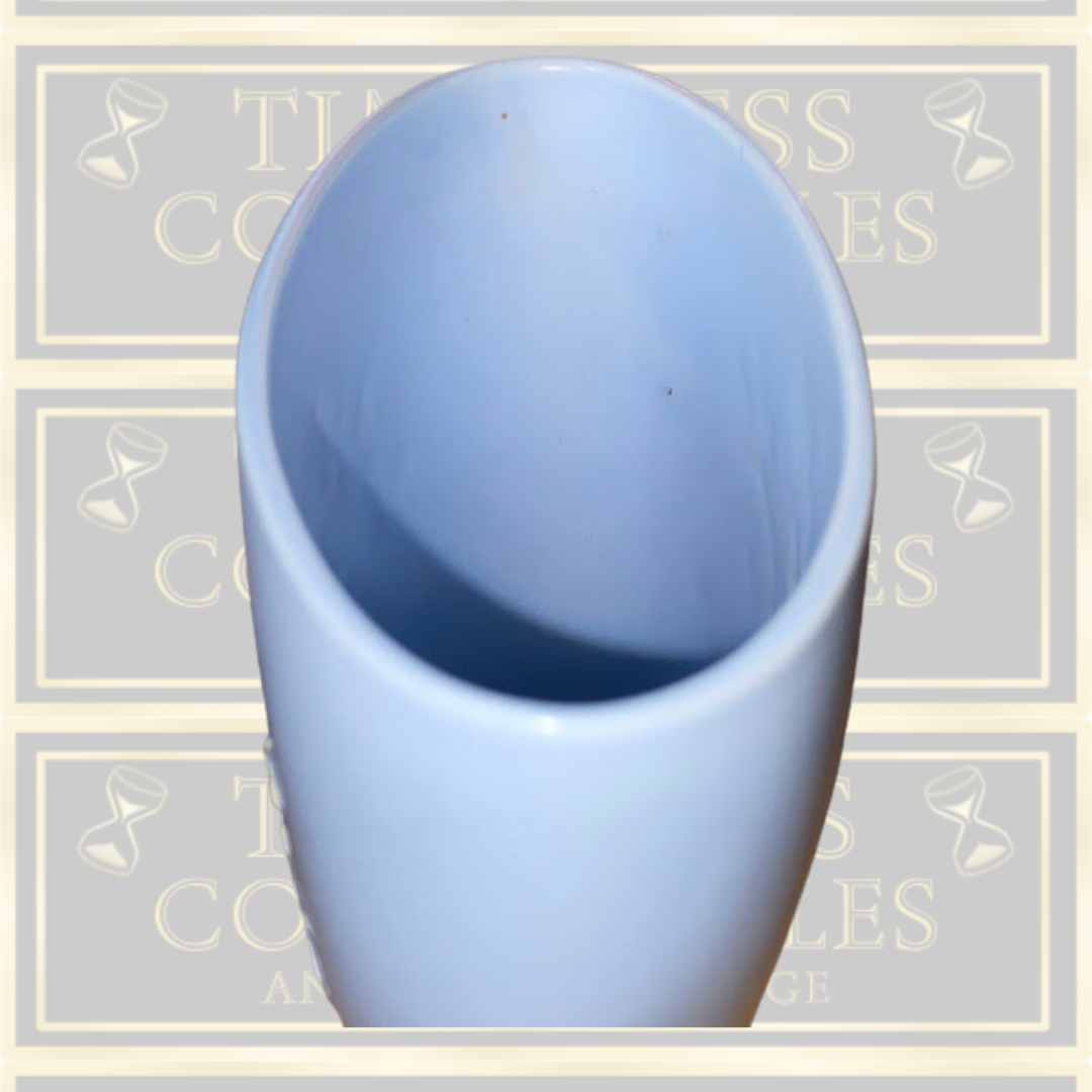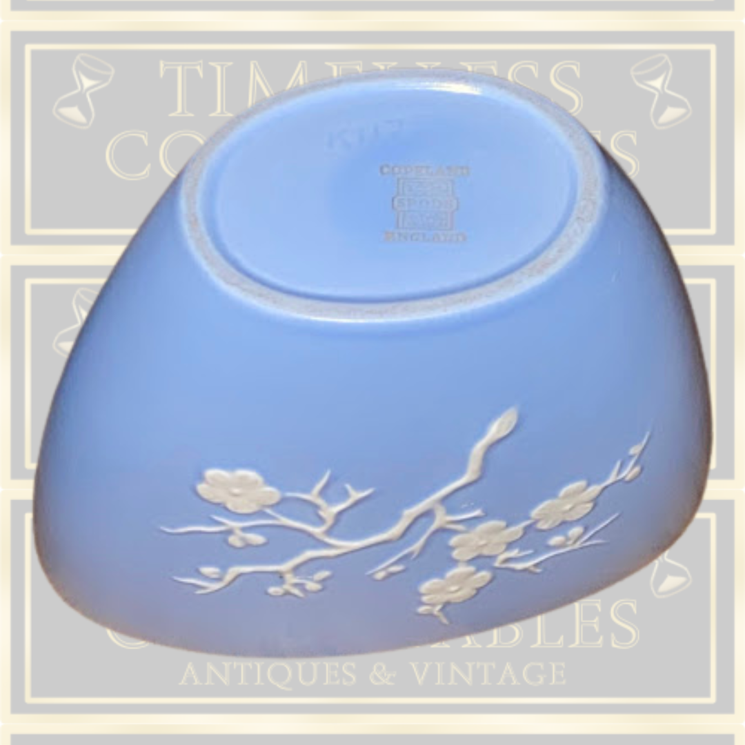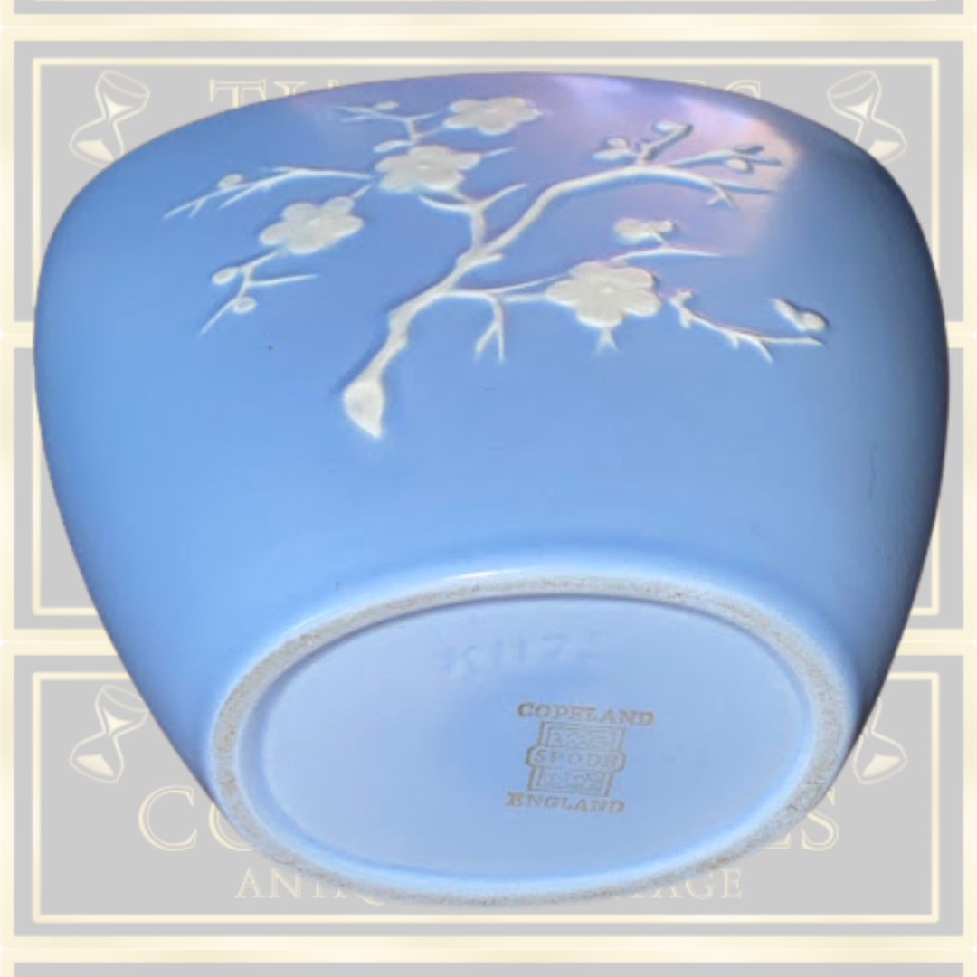 Vintage Copeland Spode ceramic vase with its delicate raised cherry blossom motif rendered in white against a serene light blue background. The design adorns both sides of this compact vessel, creating visual interest from every angle. Standing 11cm in height with dimensions of 13cm long by 6.5cm wide, it's ideally proportioned for display on shelves or mantels. The piece bears the maker's backstamp, confirming its authenticity. Remarkably well-preserved, this vase exhibits no chips, cracks, or crazing,