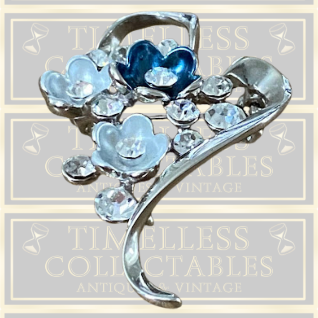 Vintage Crystal & Alloy Brooch With Blue Enamel Clear Floral Design