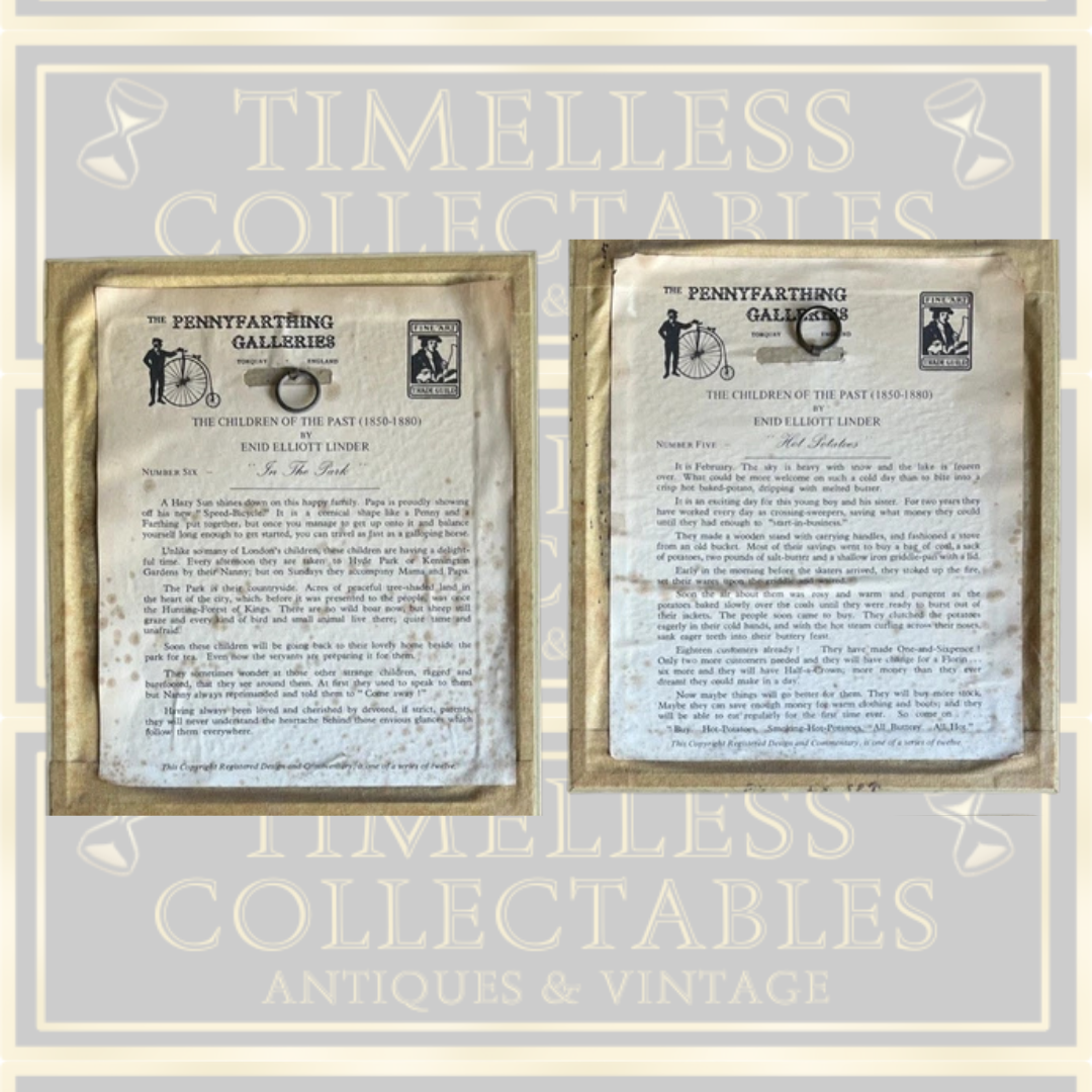 This vintage collection features four framed silhouette prints from Enid Elliott Linder’s "Children of Old London" series, created by Pennyfarthing Galleries. Each hand-tinted print is signed by the artist and includes the titles: Wee Lassie on a Bike, Aiding Her Sister At Play, Keep a-Running on Your Toes, and Little Chimney Sweeps.