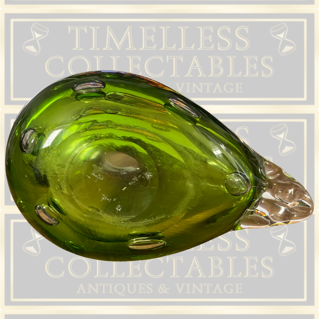 This vintage glass vase is crafted in the shape of an owl, featuring a distinctive controlled bubble design. It measures 7.5 inches in height and 7 inches in width, weighing a substantial 1331 grams. The piece remains in excellent condition, showcasing both craftsmanship and durability.Not signed but top quality blown glass in a mixed green and beautiful purple, 99% Sure it is Murano