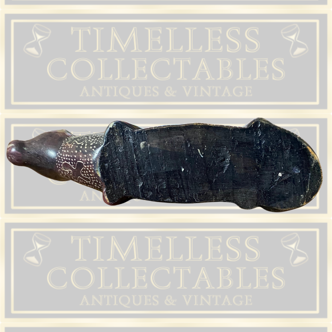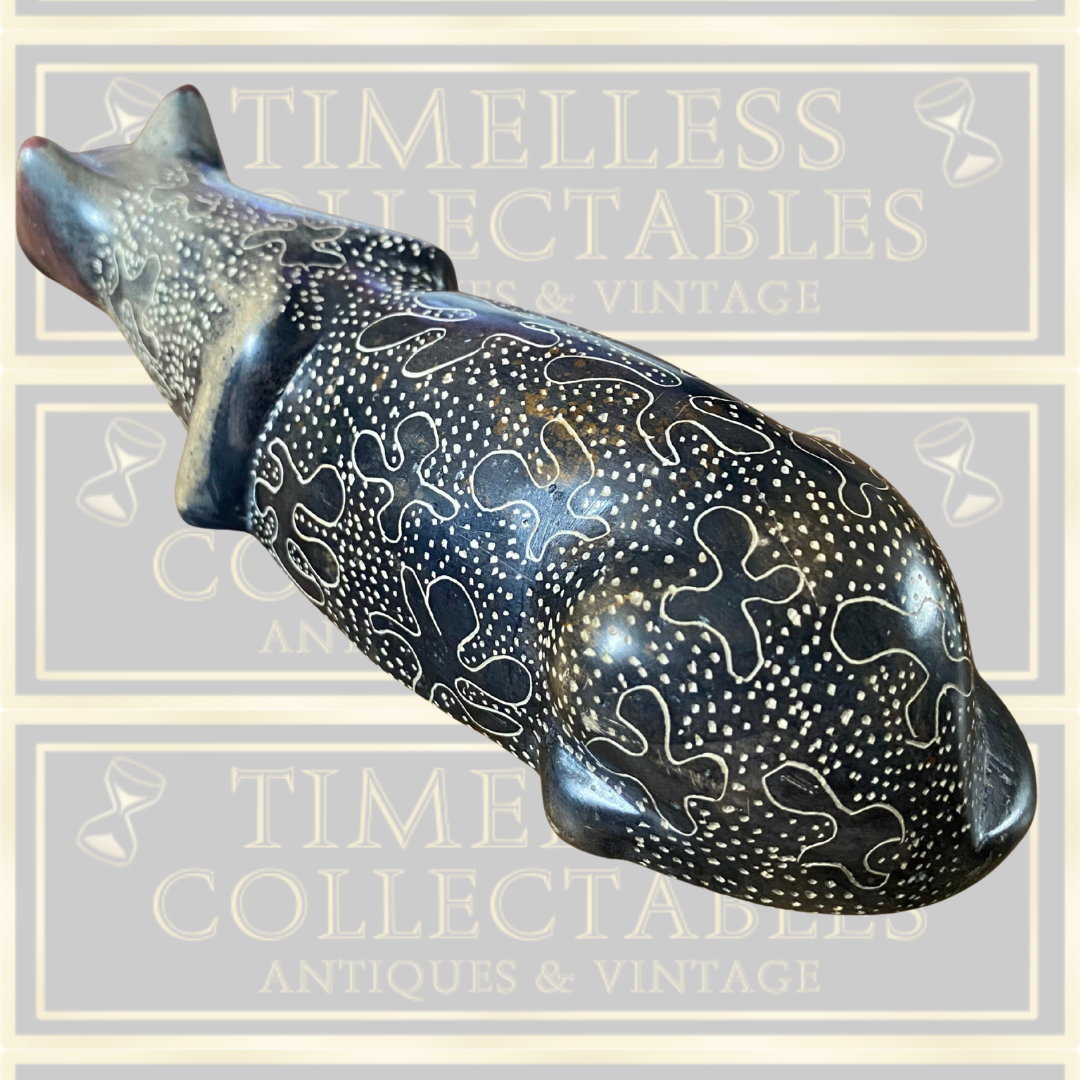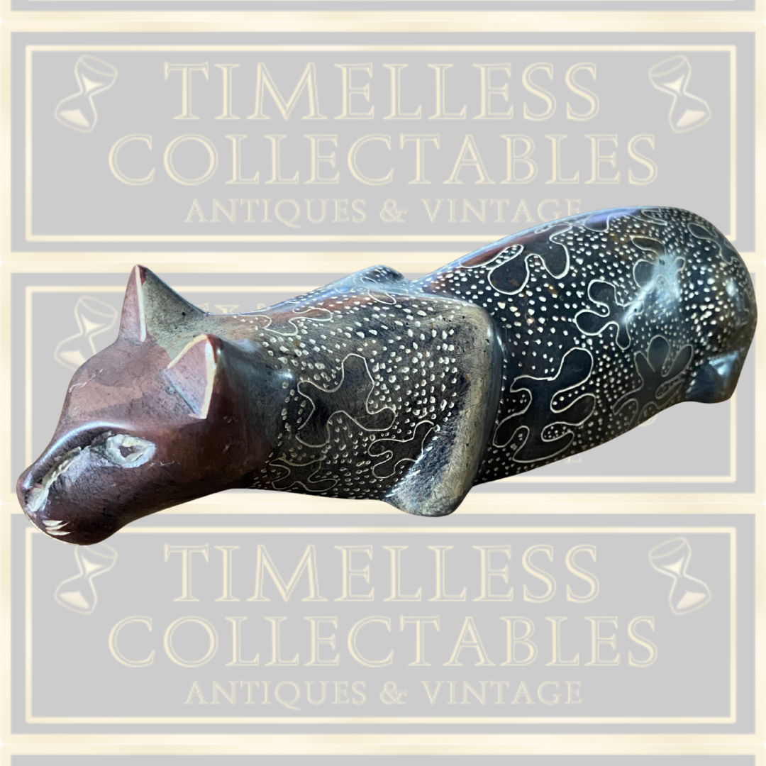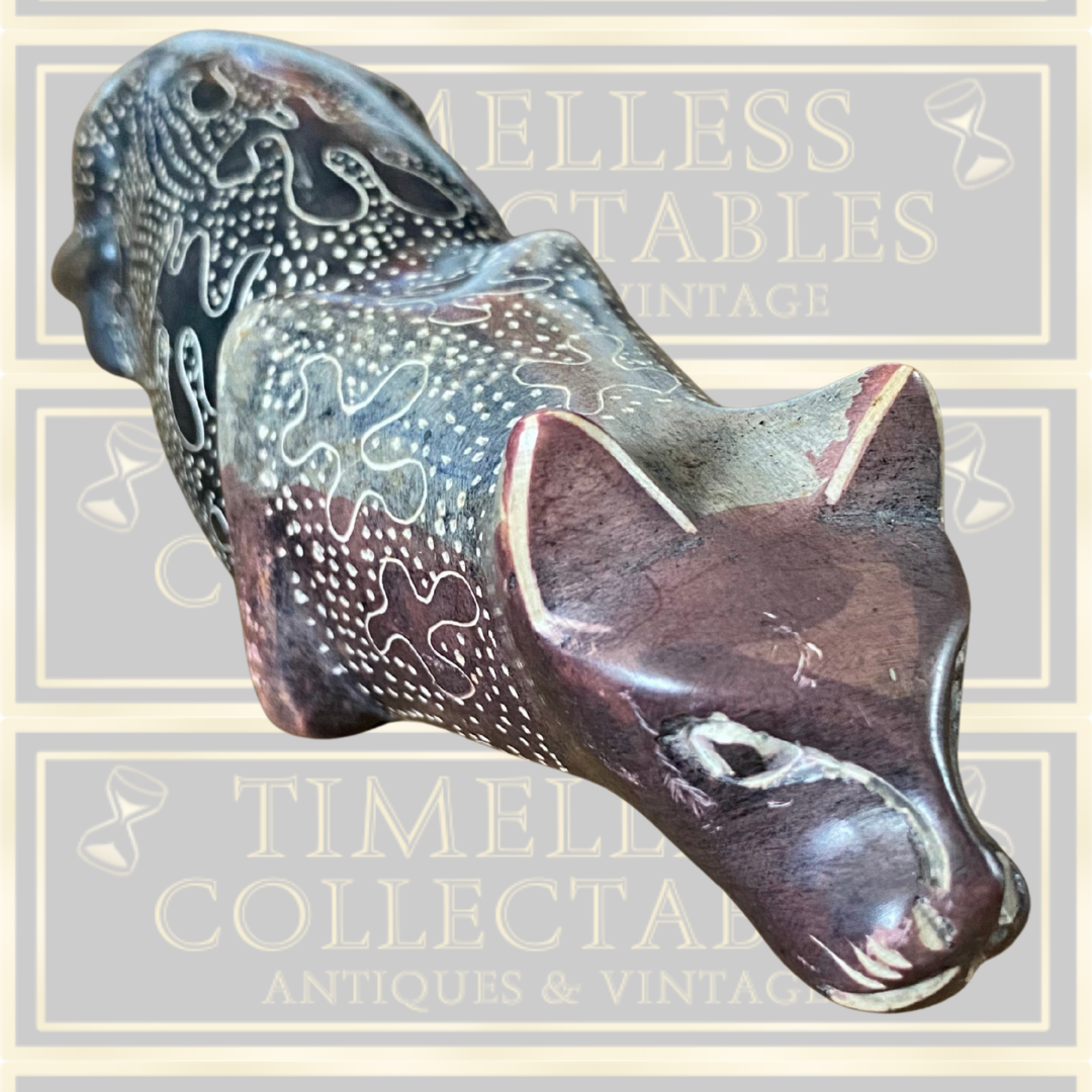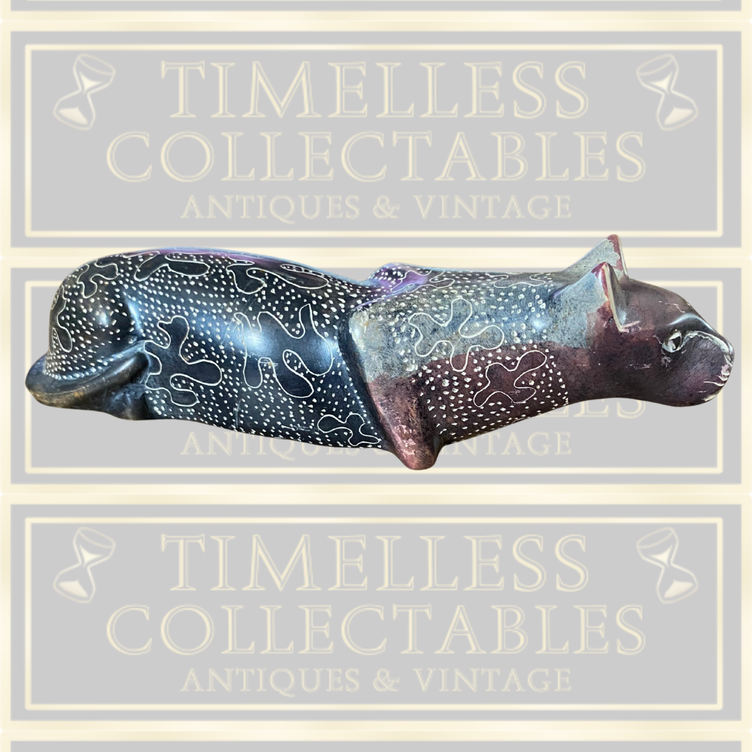 This 7-inch hand-carved stone leopard statue from Kenya is an authentic vintage piece showcasing intricate craftsmanship. Featuring detailed patterns across its surface, this figurine embodies African artistry and cultural heritage. In excellent condition, it serves as a distinctive collectible and a compelling conversation piece, reflecting the rich traditions of Kenyan stone carving.