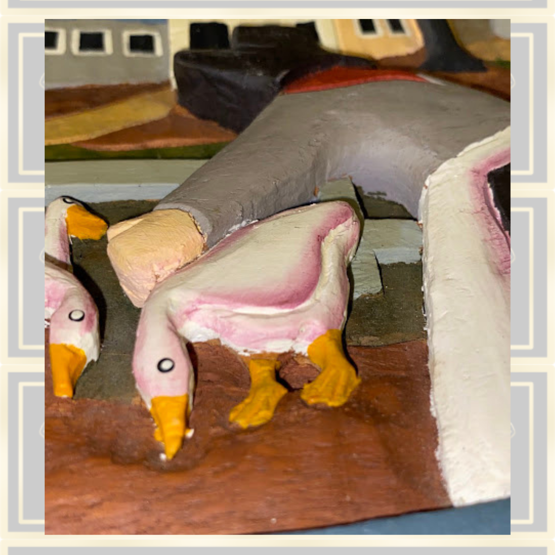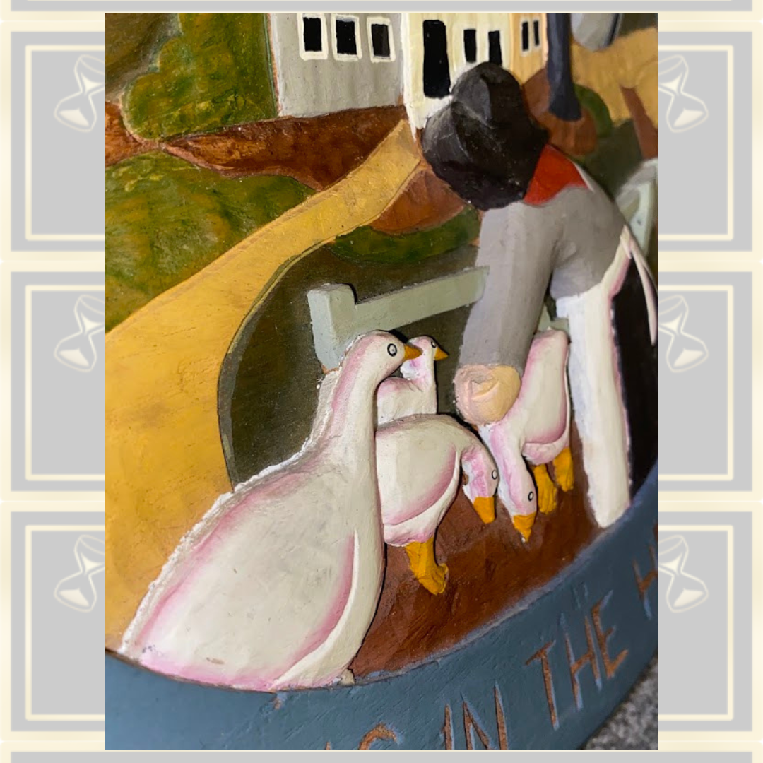 Vintage Hand Carved Wood "Home is in the Heart" wall Carving folk art, This beautiful wall art features a women and geese in a country Farm scene, Carved from wood and painted in vibrant colors. The piece is not signed by an artist. The intricate carvings and country-style make it a unique addition to your collection of decorative figurines. The wood carving is handmade and finished with stain and paint. It is suitable for adults and adds a people-themed touch to any room. Approximately 14 inch x 12 inch String to hand