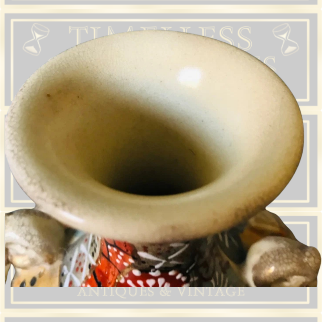 This exquisite Japanese ceramic captures the refined artistry of the early 20th century Satsuma export production. Hand-painted with meticulously detailed figures adorned in vibrant robes, the piece showcases masterful application of gold leaf and enamel embellishments against an elegant ivory crackle-glaze base. Ornamental applied handles and traditional polychrome detailing in red, gold, and black exemplify the sophisticated decorative vocabulary of the period. Standing approximately 20 cm in height, this hand-painted ceramic vessel represents a distinguished example of Japanese craftsmanship from circa Meiji period (1868-1912) . The piece displays very good vintage condition with characteristic age-related crazing consistent with authentic Satsuma glazing techniques. Unsure of the signature