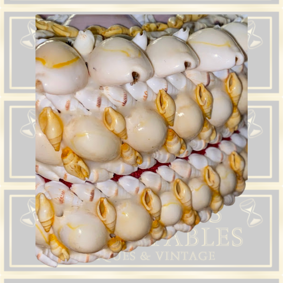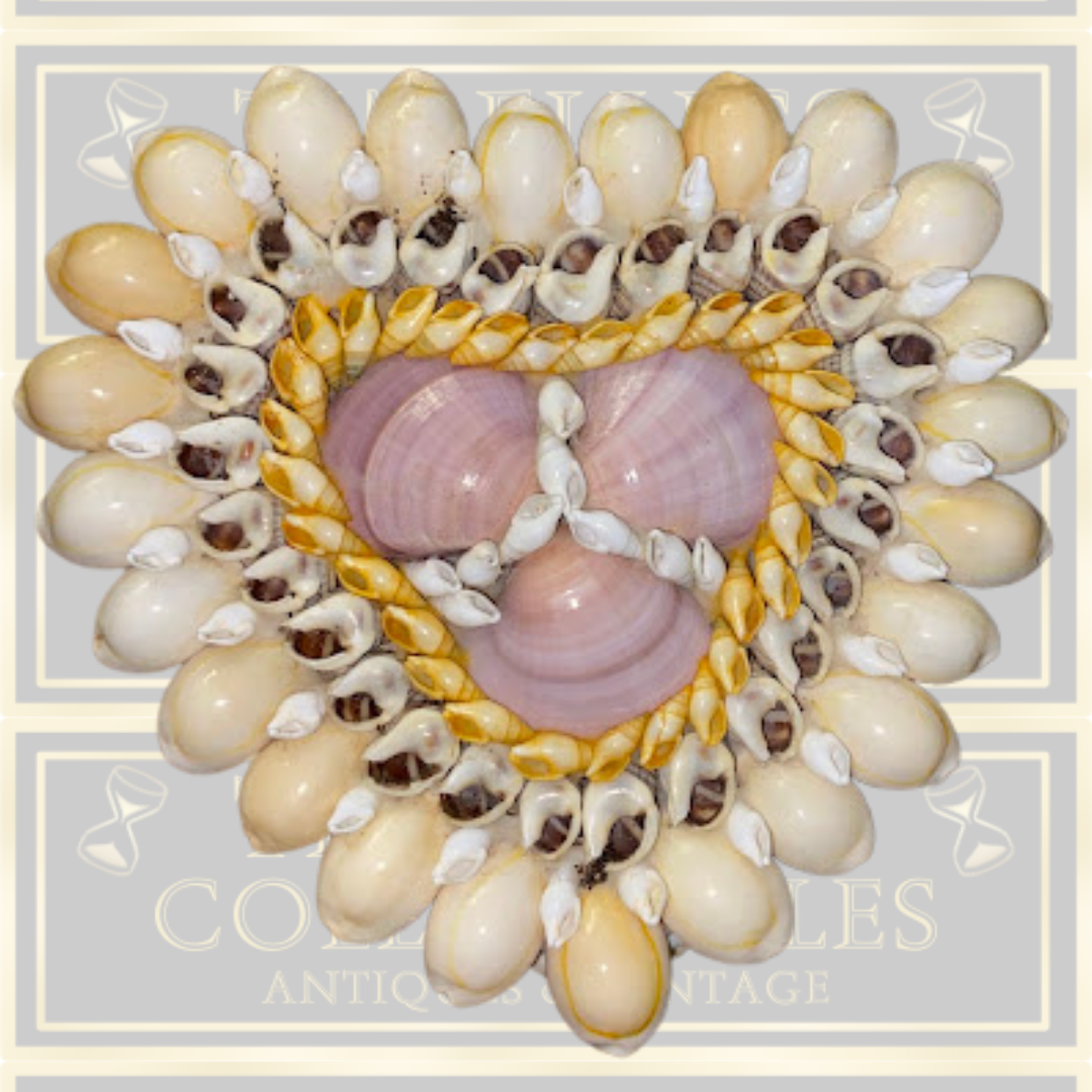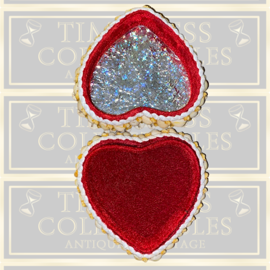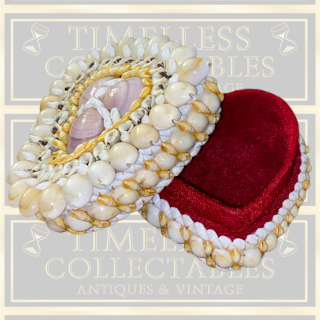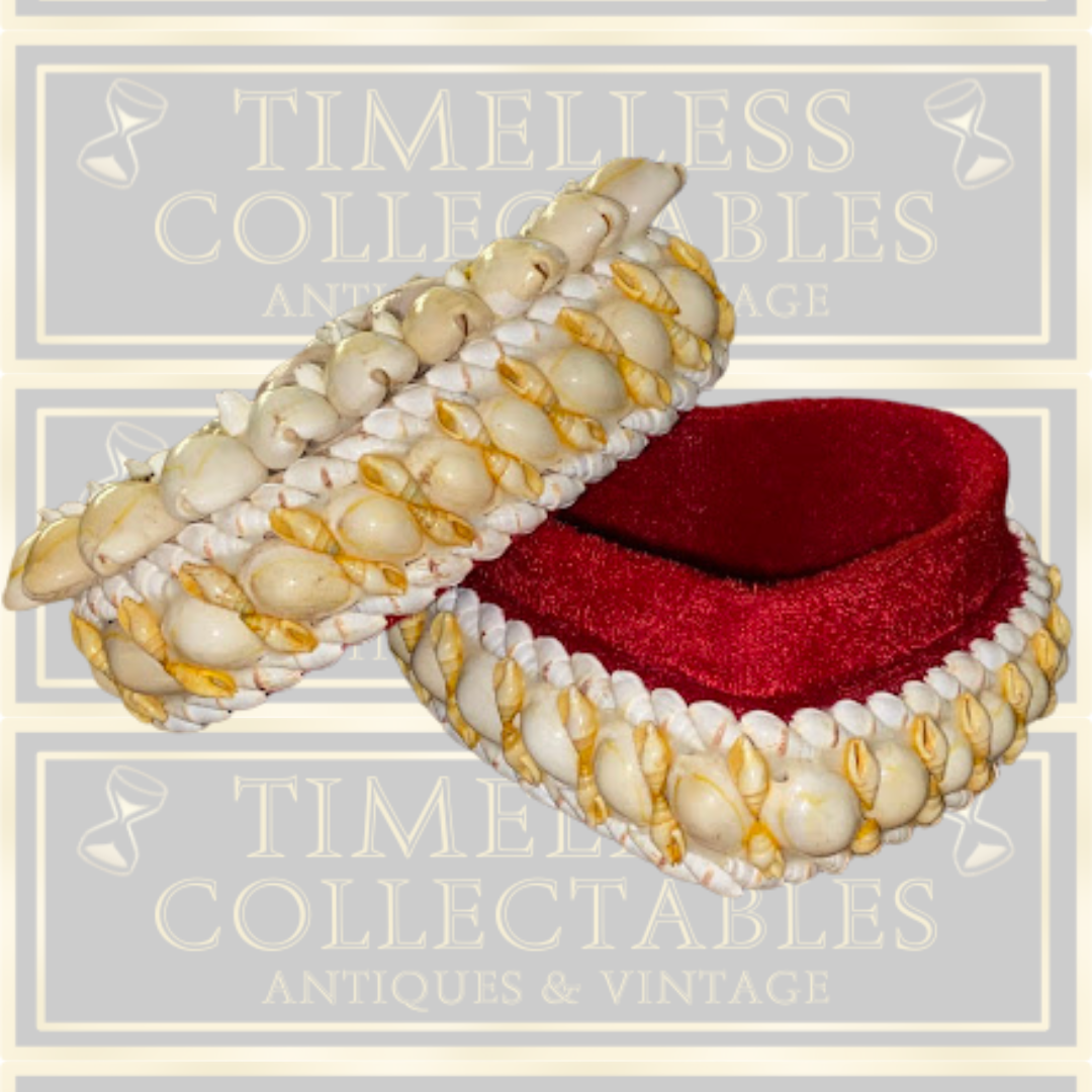This handcrafted folk art heart shaped trinket box showcases an elegant heart silhouette meticulously adorned with lustrous cowrie shells, each displaying a distinctive porcelain-like finish. The interior features sumptuous red velvet lining complemented by silver tinfoil detailing on the lid, creating a refined presentation for your most cherished jewellery and keepsakes. The generous proportions accommodate substantial collections, whilst the ingenious slot-together construction ensures effortless access. A charming floral motif graces the base, adding vintage character to this distinctive piece.