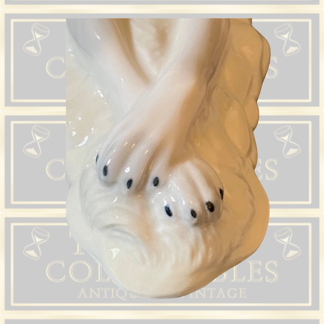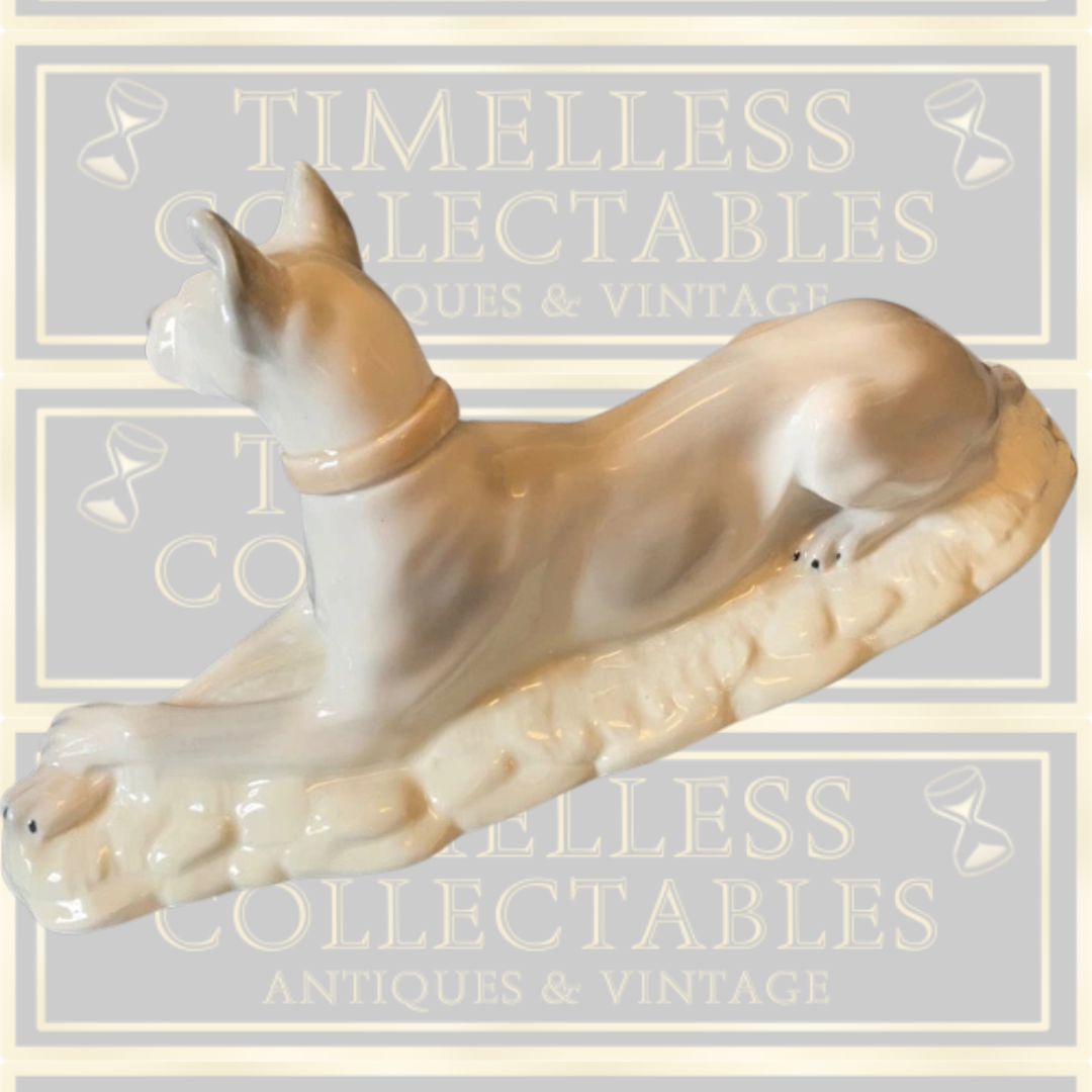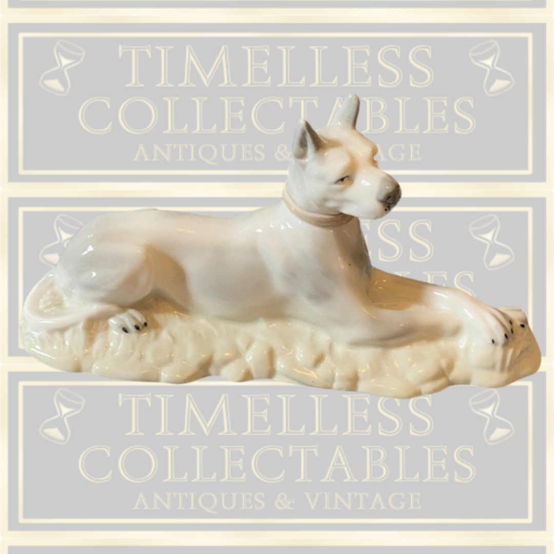 Vintage Jango Ceramics Great Dane Figurine. This exquisite porcelain statue features a well-preserved Great Dane in a restful pose, showcasing a finely detailed face with no chips or cracks. Crafted in Spain, it stands as a highly collectible piece for ceramic enthusiasts. 9 inches long