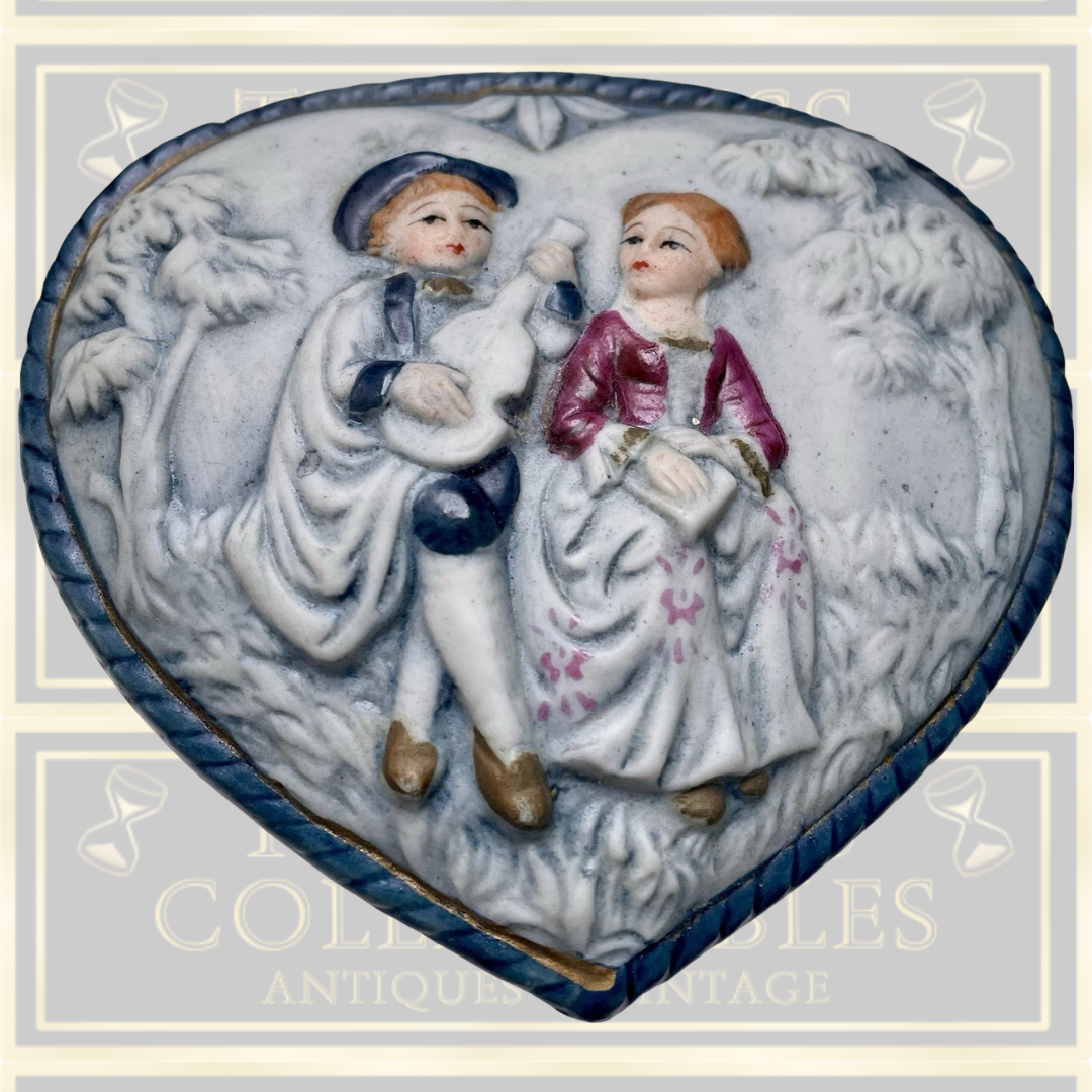 This exquisite heart-shaped porcelain casket exemplifies late 19th-century Japanese craftsmanship. The hinged lid showcases an intricately hand-painted romantic tableau of an amorous couple, whilst the sides feature elegant blue scrollwork borders. Supported by three delicate feet adorned with matching scroll detailing, this decorative trinket box presents an authentic period piece with authentic patina. The base bears an unmarked maker's stamp. Dimensions: approximately 7.5cm height, 10.8cm width at widest point. Minor surface wear consistent with age enhances its provenance and character. Nippon Yusen Kaisha