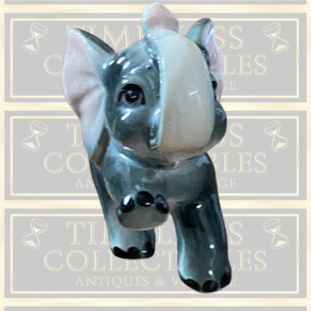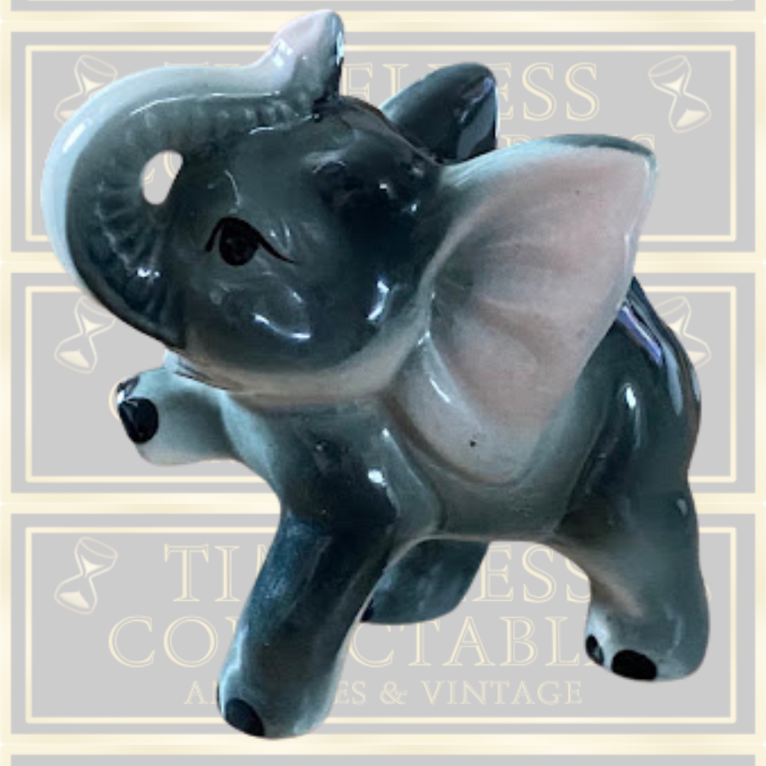 This charming mid-century elephant figurine exemplifies the whimsical aesthetic of 1950s design. Captured in a dynamic walking stance with its trunk raised expressively, the piece displays excellent preservation throughout. The base bears foreign markings, suggesting Japanese manufacture.