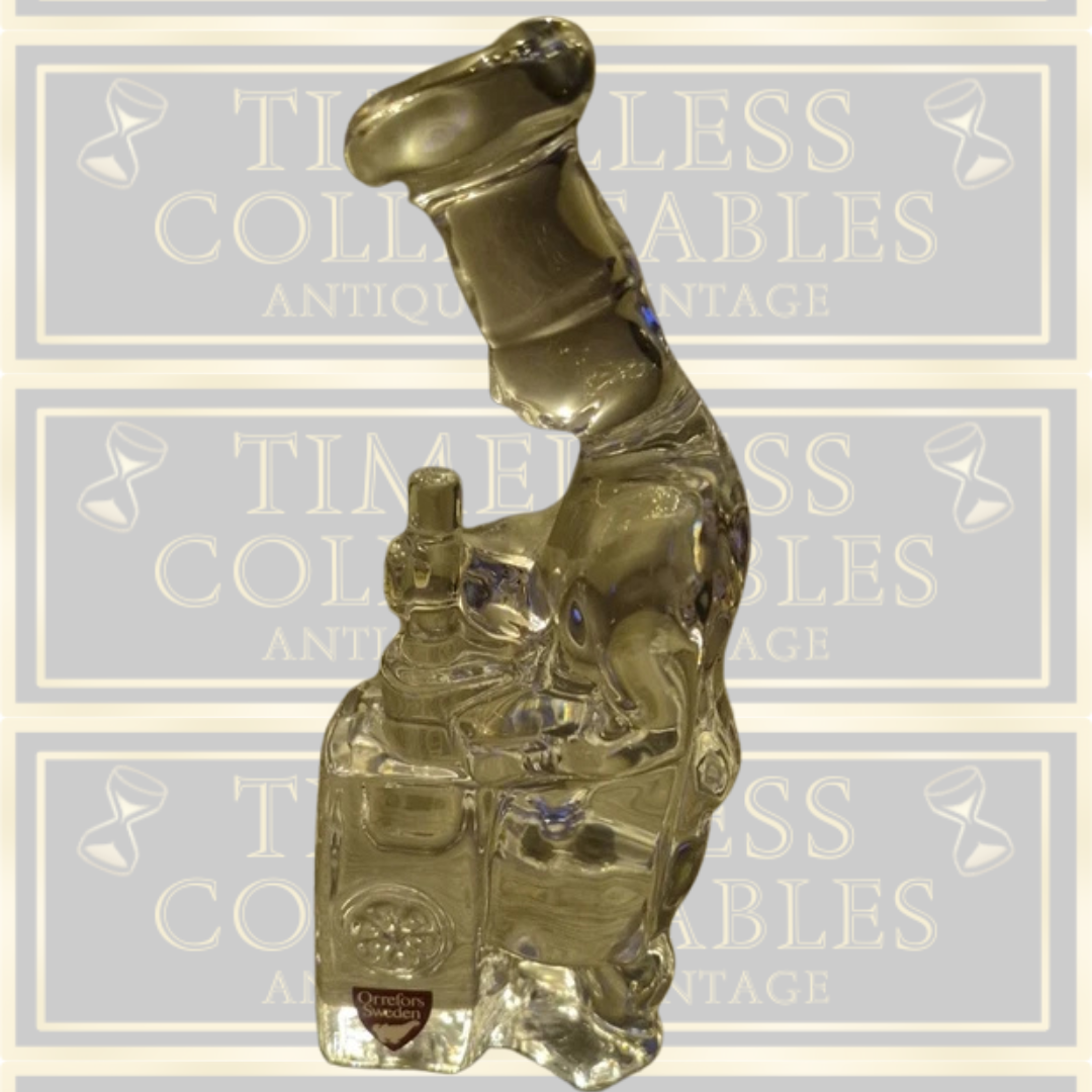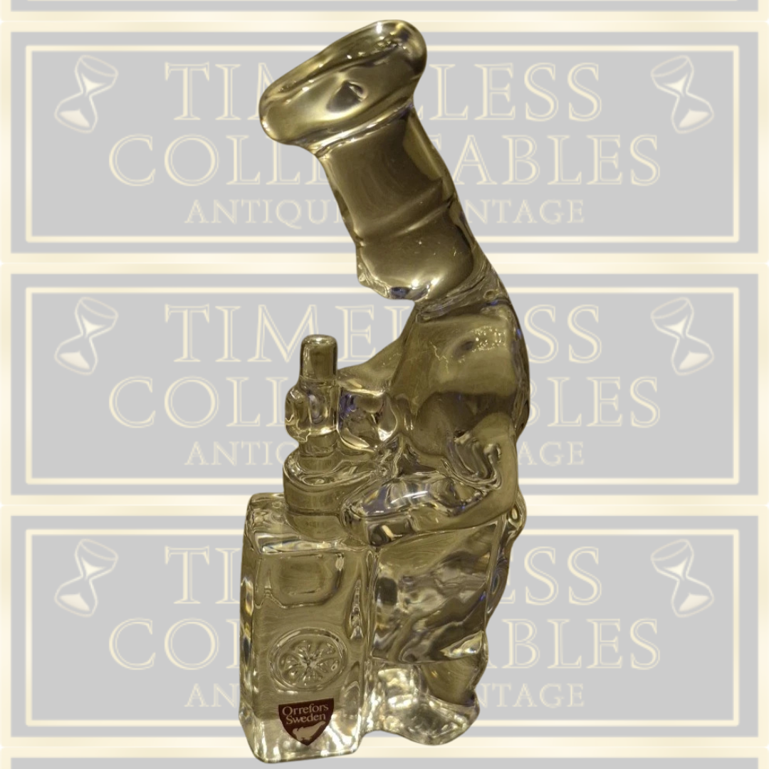 This distinguished Orrefors crystal paperweight showcases a chef figure adorned with a traditional toque, exemplifying the refined craftsmanship of Sweden's renowned glassworks. Part of the prestigious Craftsman Series, this Scandinavian art glass piece demonstrates exceptional clarity and precision in its sculptural form. Preserved in pristine condition with original maker's markings and sticker intact, it represents a significant addition to any decorative collection. The dual functionality as both paperweight and figurine makes it an ideal gift for culinary professionals or discerning collectors of Nordic design.please note this is clear glass with no colour