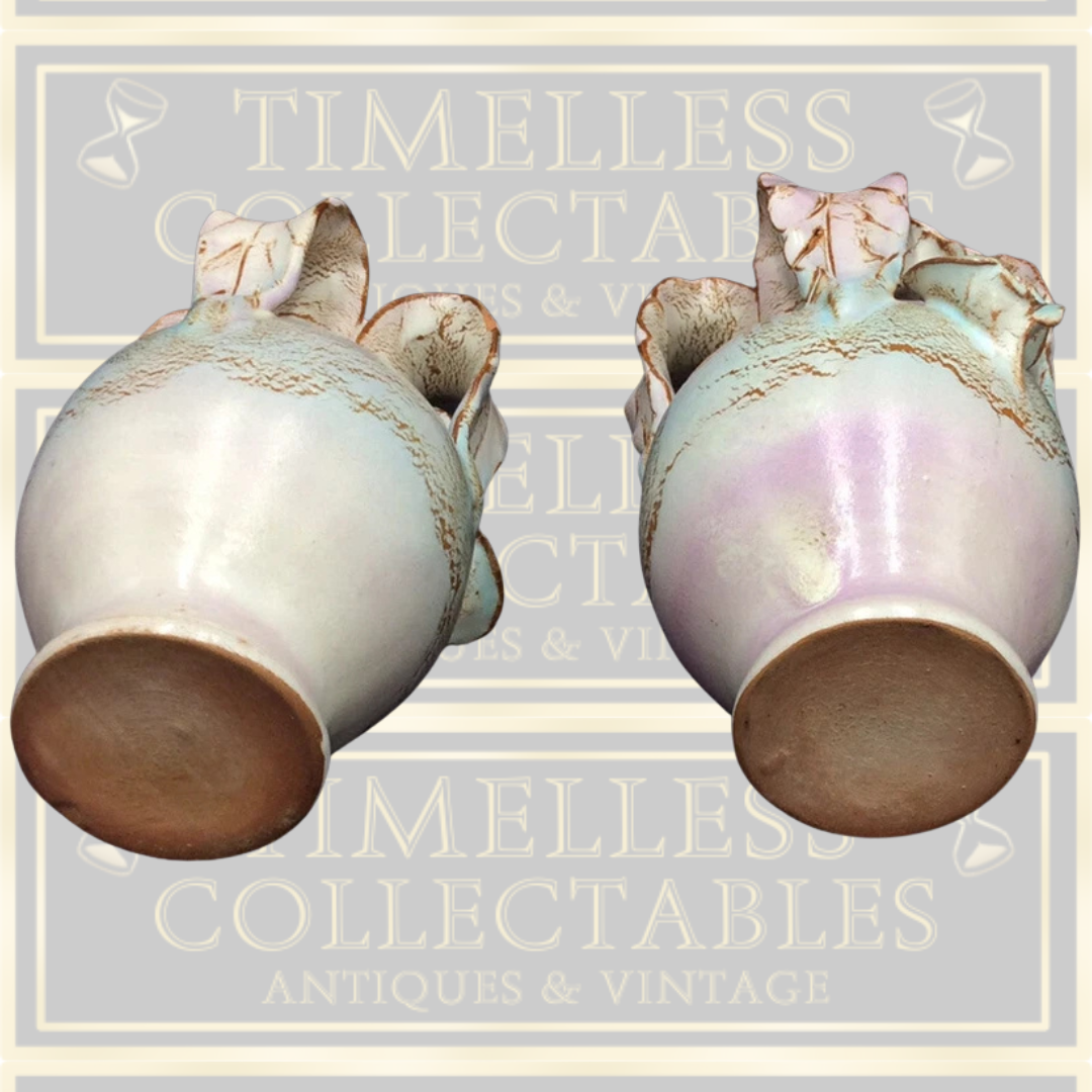 These exquisite handcrafted studio pottery bud vases represent a distinguished example of vintage artisanal ceramics. Standing approximately 5 inches in height, the pair showcases the organic, freeform aesthetic characteristic of mid-century studio pottery movements. Each vessel demonstrates meticulous craftsmanship with its individually sculpted form, whilst remaining in exceptional condition with no visible damage. The subtle variations inherent to hand-thrown pottery ensure these pieces possess genuine character and authenticity that mass-produced alternatives cannot replicate. An ideal acquisition for discerning collectors seeking authentic studio pottery with provenance and artistic merit.