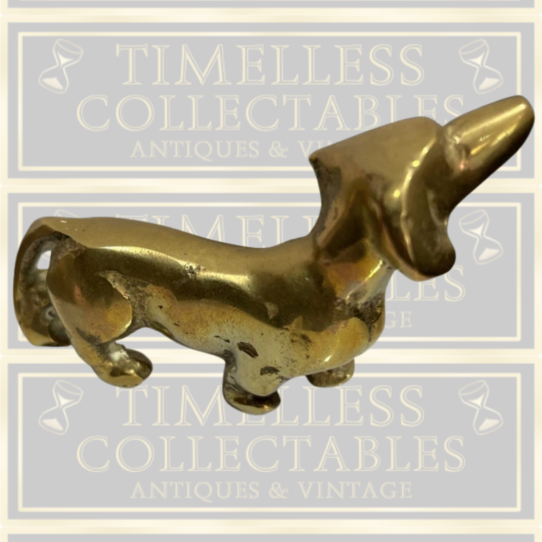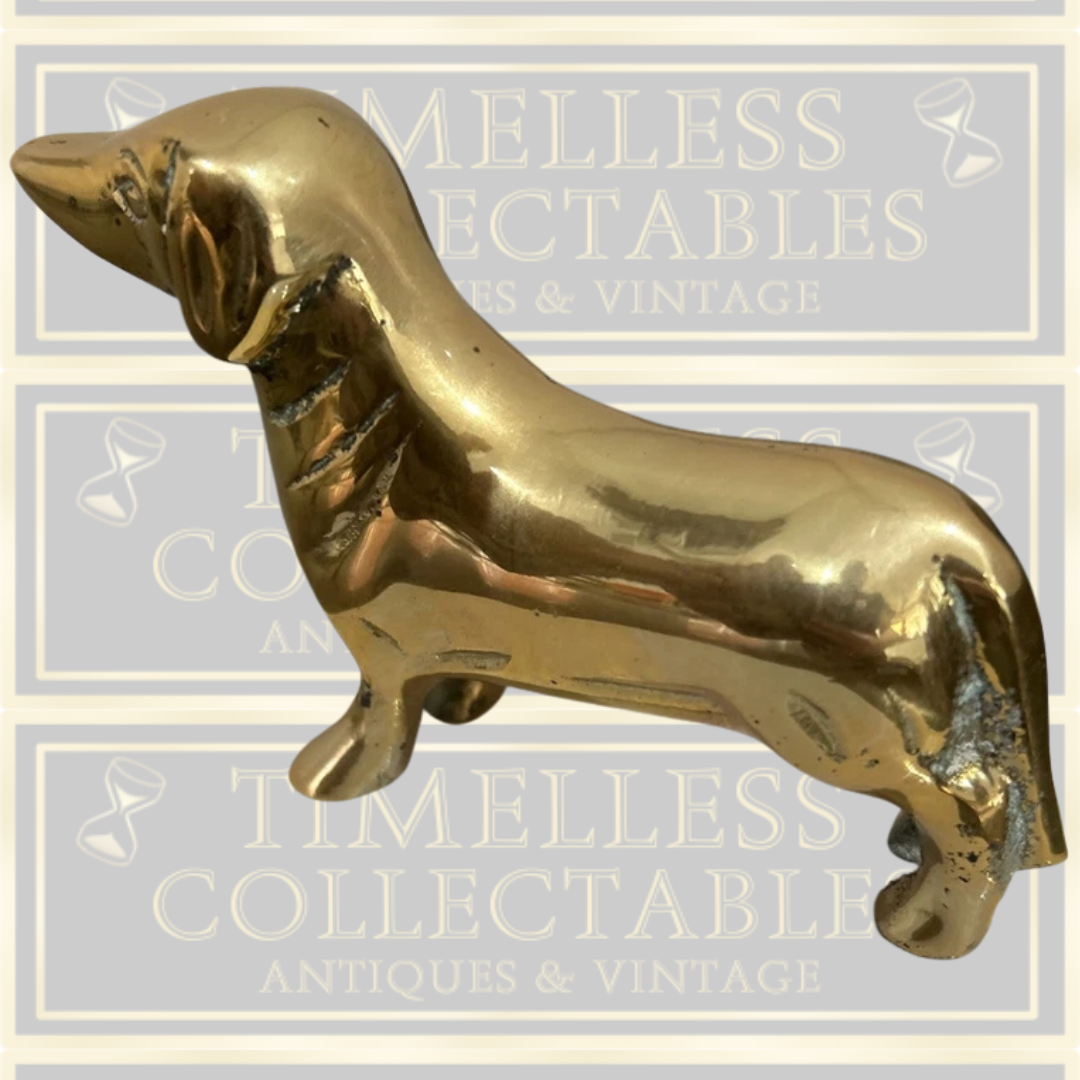 These charming brass dachshund figurines showcase the breed's distinctive elongated form in a sophisticated vintage style. The pair comprises a larger mother dog and smaller puppy, both meticulously crafted from solid brass with a refined polished finish. Built to last, these sturdy pieces demonstrate expert craftsmanship and make an elegant addition to any collector's display. Brass décor continues to experience a resurgence in interior design, making this timeless duo a worthy investment for those who appreciate quality vintage collectables.