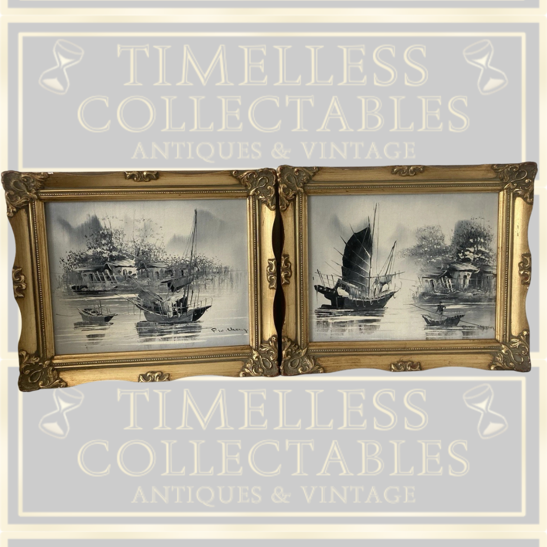 A distinguished pair of Chinese junk boat paintings by P W Cheng, each measuring 10 inches in height by 12 inches in width framed. These matching works feature striking black and white renderings of traditional Chinese vessels, presented in elegant gilt frames. Both pieces remain in excellent condition and create a compelling visual impact when displayed together, offering a refined addition to any interior space with an appreciation for Asian artistic heritage.