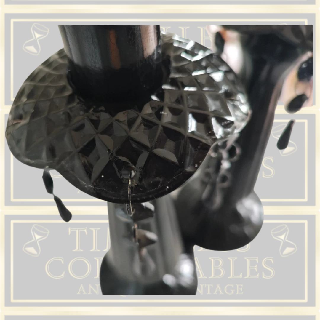 This is a matching set of vintage gothic mantle lustre candlesticks. Each candlestick is missing one drop, which remains hidden when viewed from the back. Please note they exhibit typical signs of age.