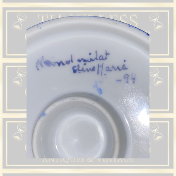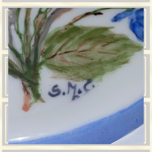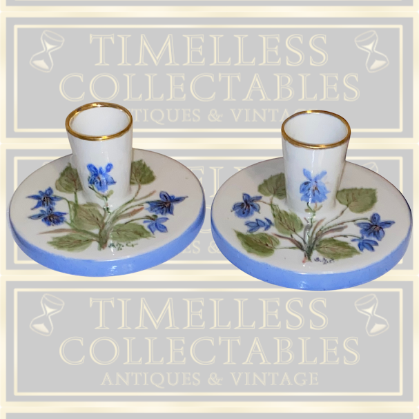 Exquisite pair of vintage Swedish candle holders, hand-painted with blue tulip-style flowers and green foliage. Each features a gold-gilded ring encircling the top and a blue circular base. Both pieces bear signatures, including initials integrated with the floral motifs;