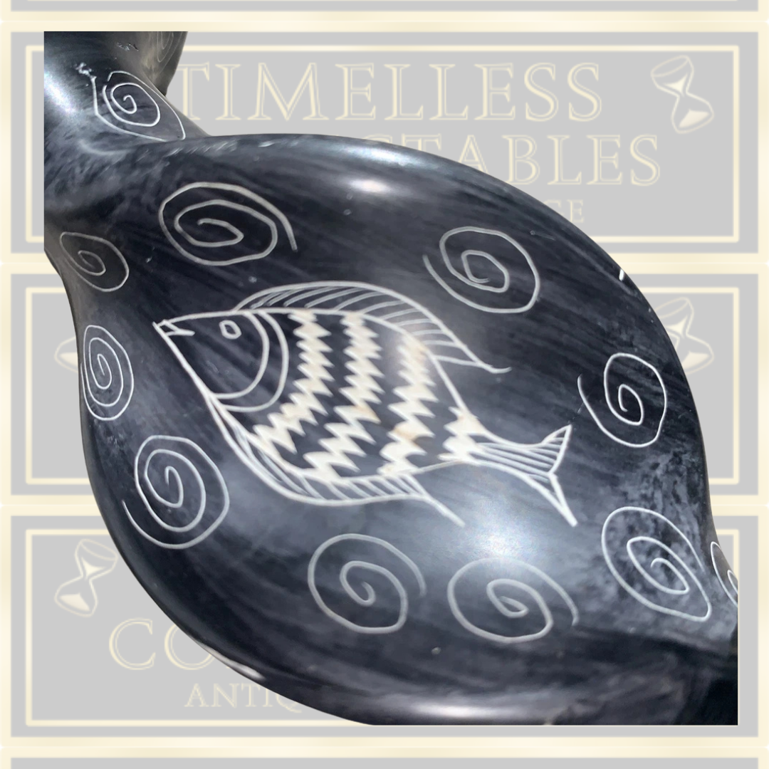 These striking soapstone candle holders showcase authentic African craftsmanship, featuring intricately engraved fish motifs across their dark surfaces. Hand-carved from durable soapstone in Kenya, this vintage pair demonstrates the skilled artistry of traditional artisans. Their substantial construction ensures lasting appeal, while the distinctive carved detailing adds cultural character to any interior. A genuine collectible piece that bridges artistic heritage with functional elegance.