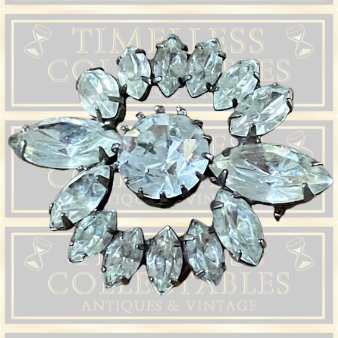 This striking vintage brooch is expertly faceted with clear rhinestones—including emerald-cut and round stones—all securely pronged into a lustrous silver-tone setting. The elegant wreath motif exemplifies mid-century atomic design sensibilities. Measuring 1½ by 1¾ inches, the piece presents excellent condition with all stones intact and secure. The reverse displays minor wear consistent with age,