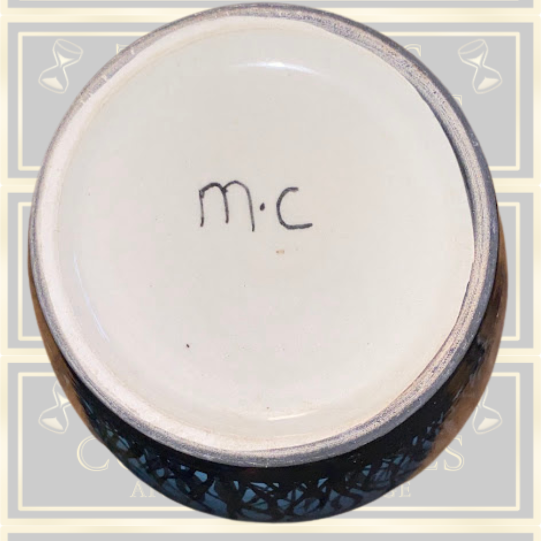 This exquisite vintage vase showcases a delicate robins egg blue glaze set against a softly water coloured background. The piece features hand-painted black silhouettes of weeds/reeds, demonstrating considerable artistic skill and attention to botanical detail. Bearing the artist's signature "M.C" at the base, this collectible represents a fine example of early twentieth-century decorative ceramics, combining refined glazing techniques with naturalistic imagery.