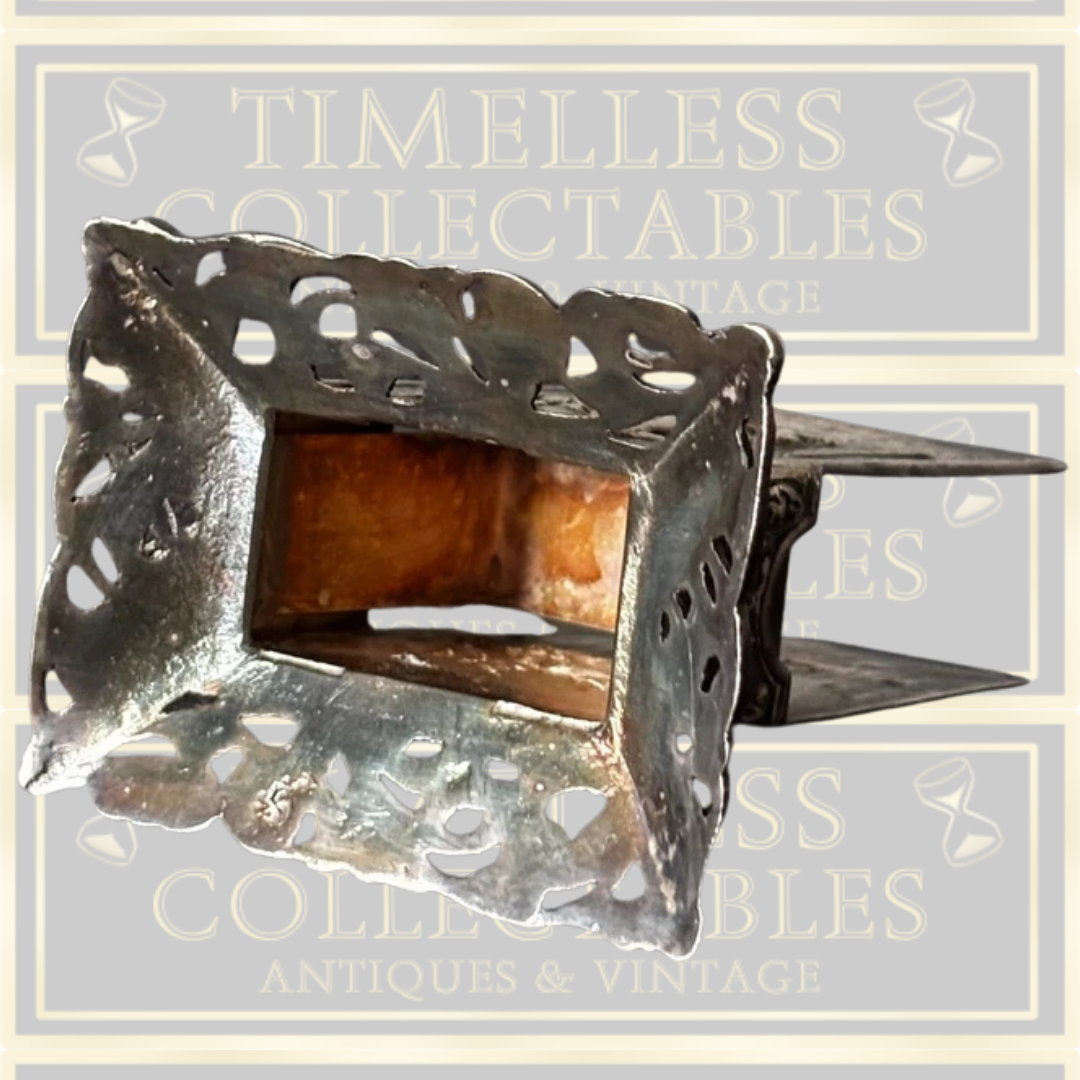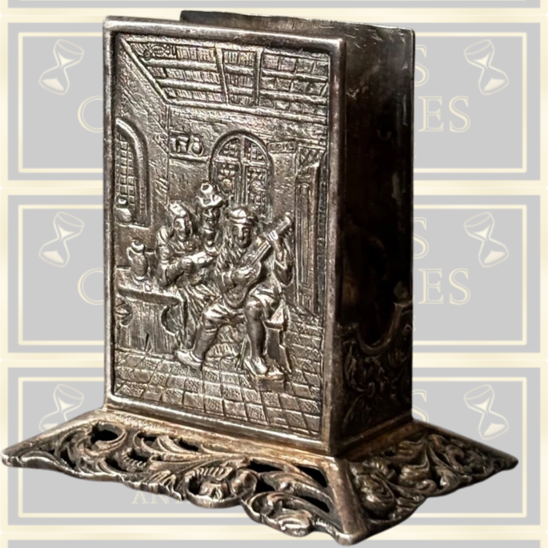 Vintage Silver Metal Match Holder Tavern Scene Engraved With Ornate Base