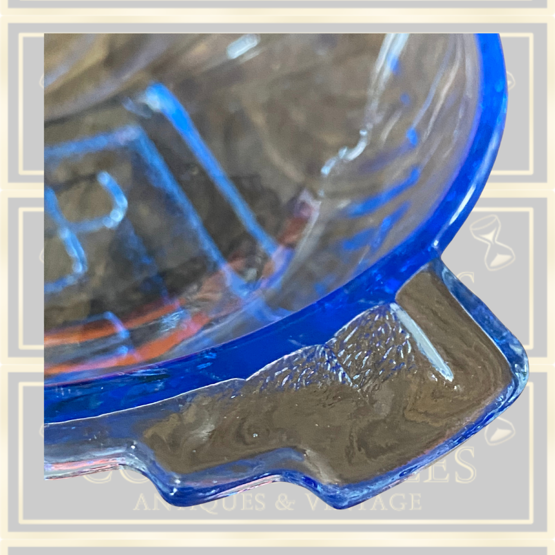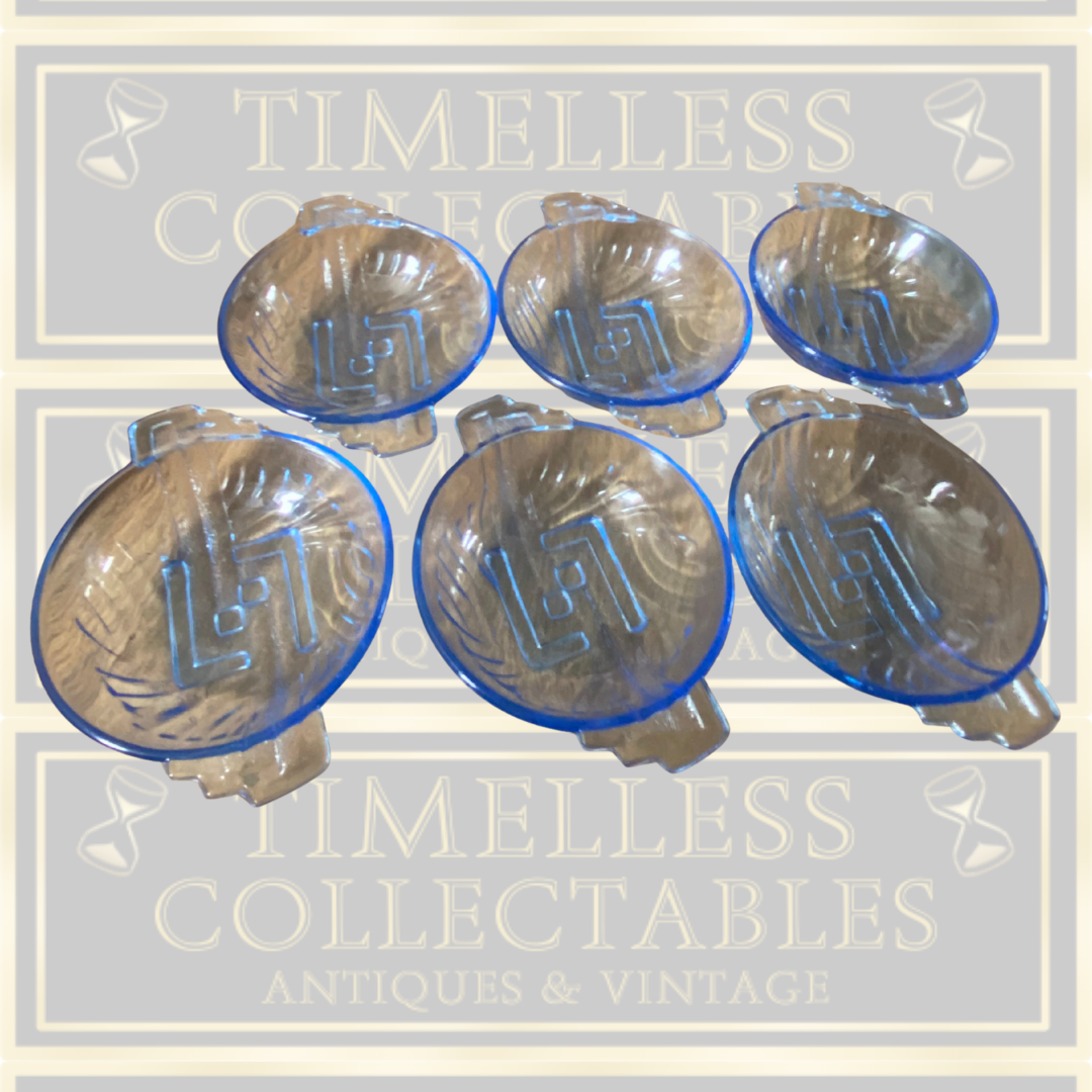 Vintage six made by Polish glassworks Stolle Nieman in the early 1930s, these wonderful dessert bowls has iconic Art Deco features with there stepped handles and geometric pattern on the base. Made from a stunning cobalt blue glass, There in perfect condition For lovers of Art Deco glassware,Please note these are clear blue glass bowls the brown is the table in the pictures