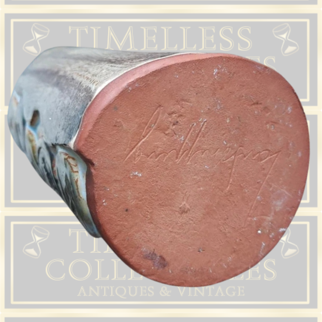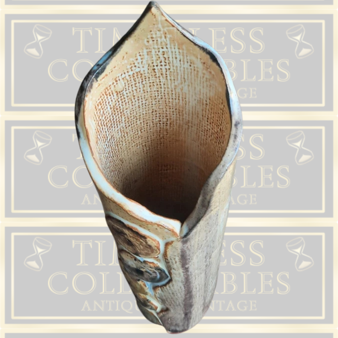 This vintage vase features a unique wrap around design, making it a standout piece for any studio-themed decor. Made from clay and stoneware with a glossy finish, this art pottery piece showcases abstract art. The beige colour adds a touch of elegance to any room, while the signed bottom adds to its charm as a one-of-a-kind find.