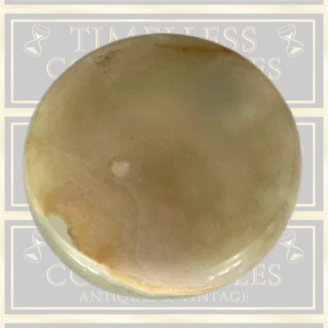 This vintage TIM desk paperweight features an elegant onyx thermometer displaying both Centigrade and Fahrenheit scales. Measuring approximately 8cm in diameter and 3.5cm in depth, it weighs 270g. Wear on the gold gilt as expected ,A sophisticated addition to any desk.