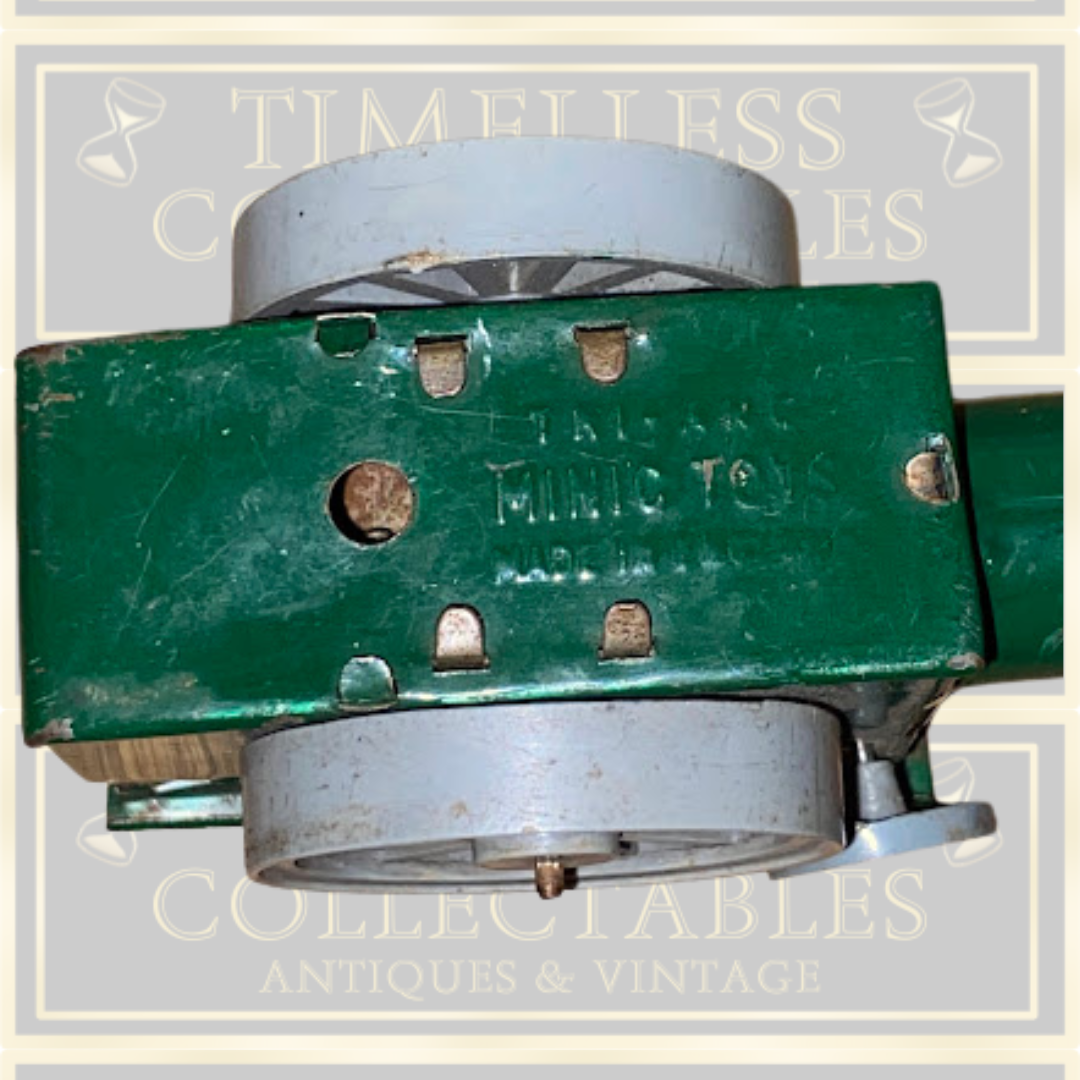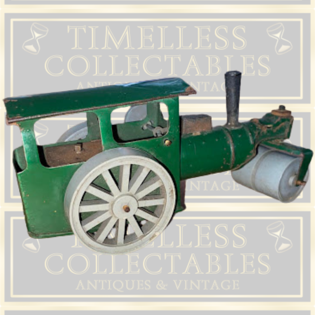 This charming Minic tin steam roller exemplifies mid-century mechanical toy craftsmanship. The wind-up mechanism functions reliably, and the original key—increasingly difficult to locate—remains intact. Surface wear consistent with age adds authentic character rather than detracting from its appeal. A fine example of vintage tinplate engineering that demonstrates both durability and nostalgic appeal for serious collectors of classic mechanical toys.